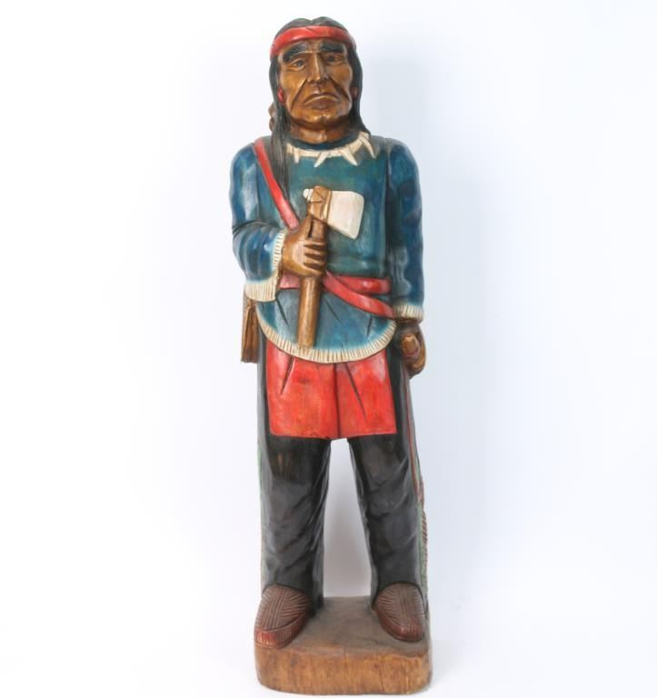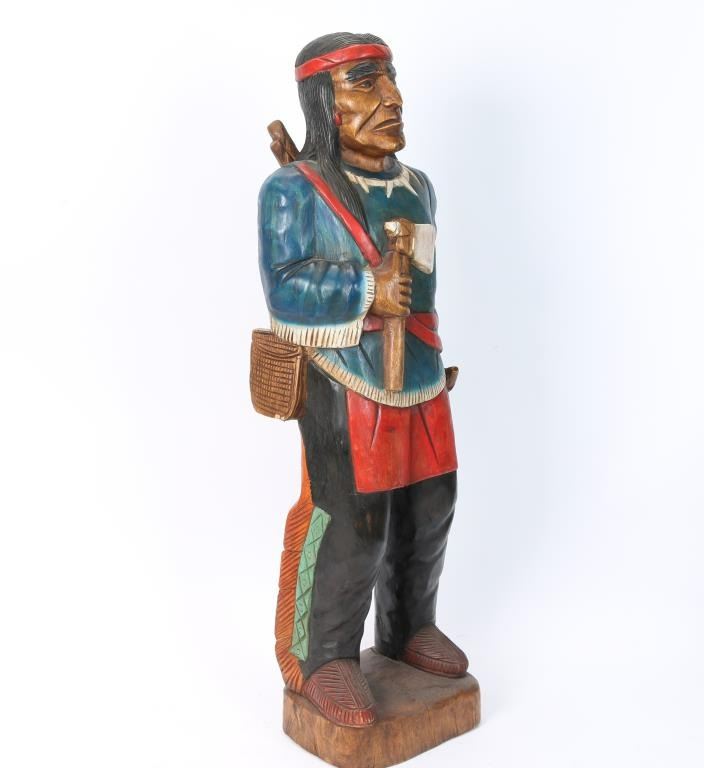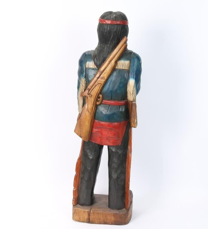 Measures 40" tall. Holding a hatchet, powder horn and rifle slung across his back. ***Buyer to arrange shipping or local Pickup Only***