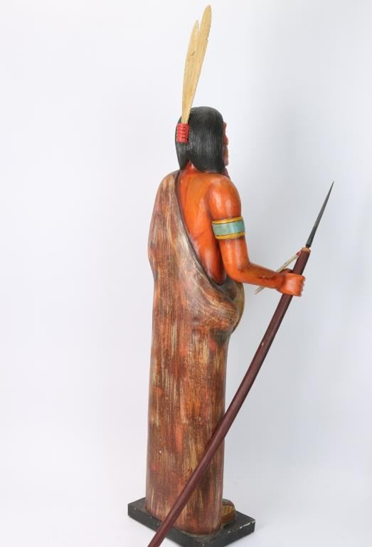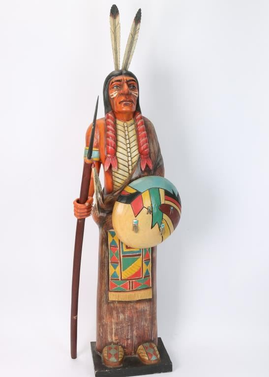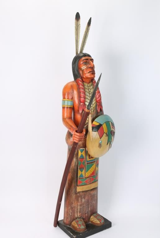 Wood carved Indian statue with shield and spear. Measures: 60" tall.