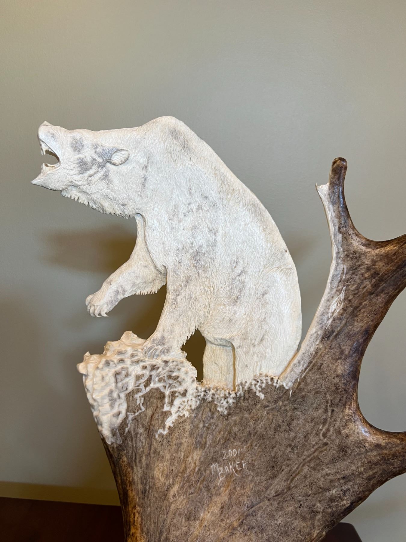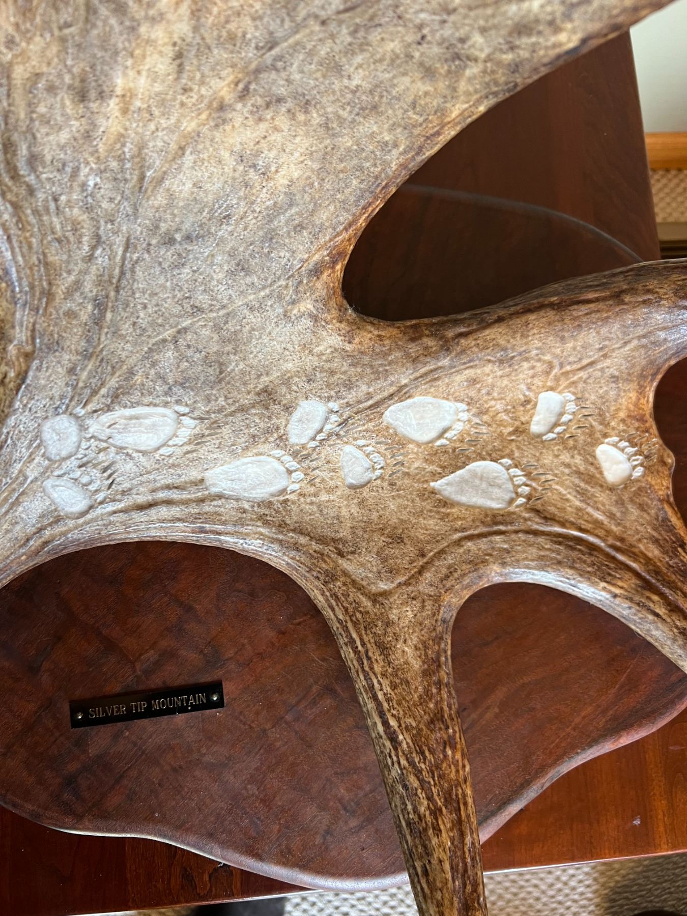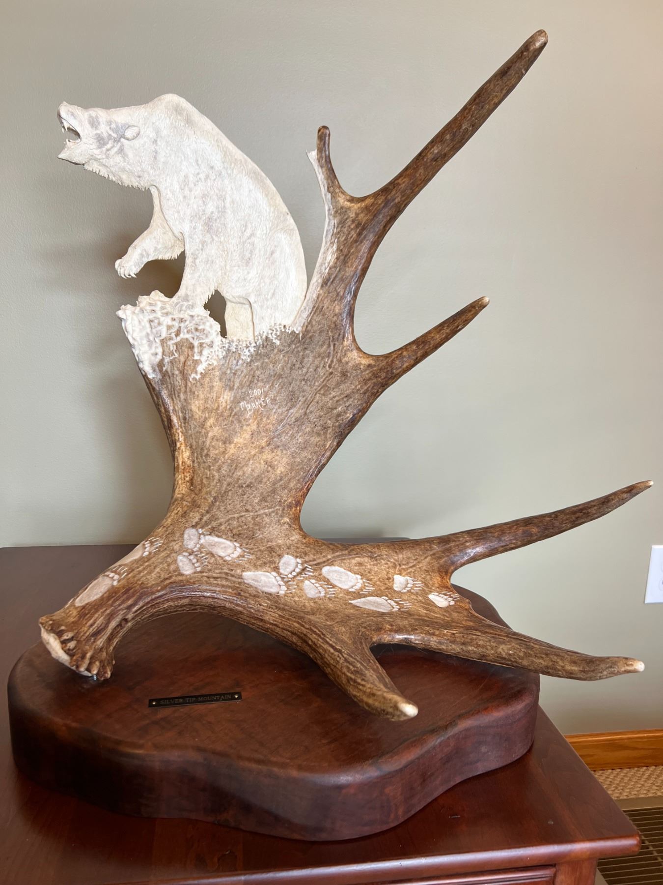 This spectacular Carved Moose Antler is titled “Silver Tip Mountain” depicting a carved angry grizzly bear with his tracks shown across the bottom of the antler. This beautiful piece is 23 inches high by 24 inches wide and would be a great addition to anyone’s trophy room to display and is in excellent condition.