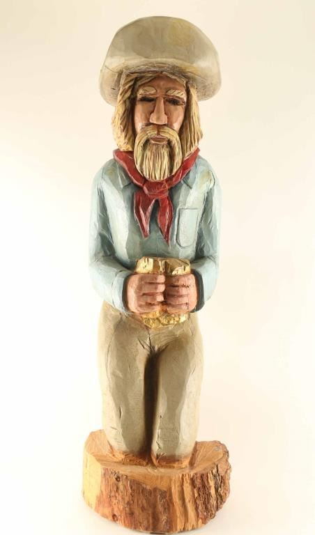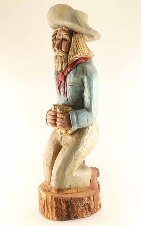 Signed "L. Knotts" 2002 on base. Miner is kneeling while holding his gold. In good condition 45" by 12". Shows natural cracking to wood.