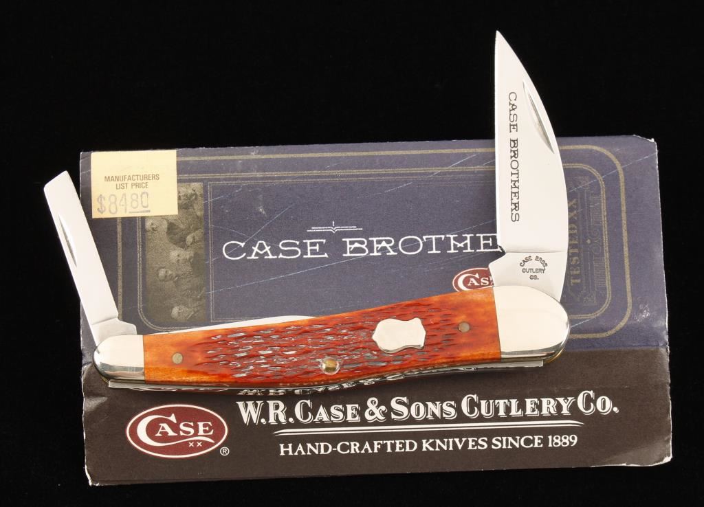 Three-bladed with jigged bone or Delrin chestnut handle. 'Case Brothers' etched blade, 6355WHSS. Mint condition in collector's tin. Mfg list price $84.80.