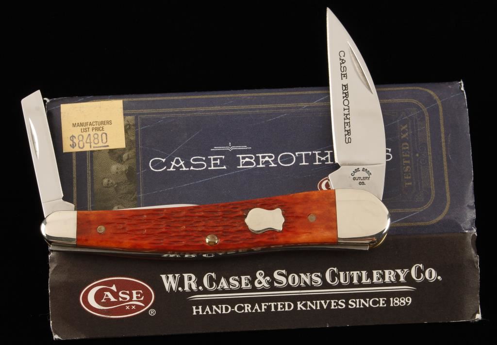 Three-bladed with jigged bone or Delrin chestnut handle. 'Case Brothers' etched blade, 6355WHSS. Mint condition in collector's tin. Mfg list price $84.80.