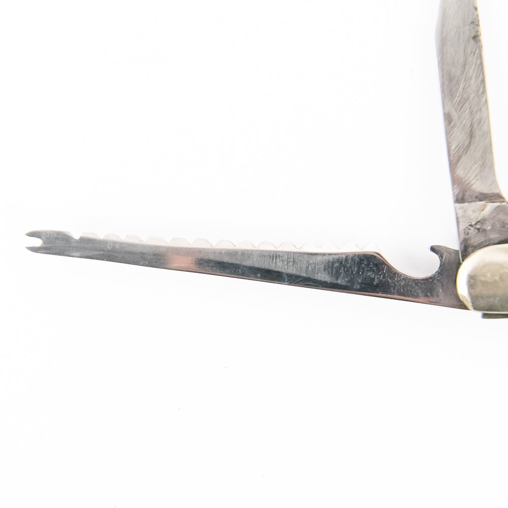 Case XX USA model 32095 Fisherman's knife. Nice old 1950s fishing knife is complete but well used. Blades are intact but sharpened down and knife still has usually missing hook sharpener still attached to yellow composite handles. 5" closed length. See photos.