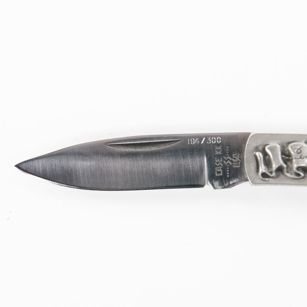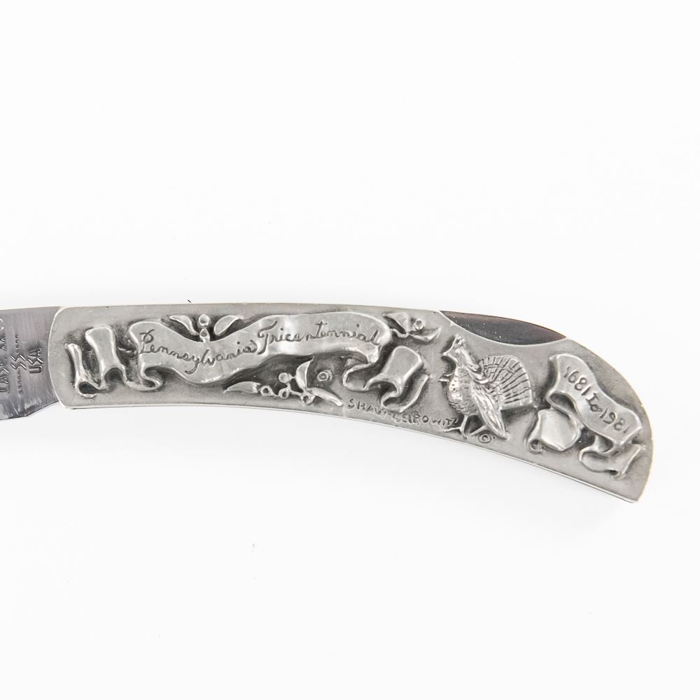 Extremely Rare Case XX single blade folding knife. Knife was factory customized with engraved handles by Shaw-Leibowitz to commemorate the Pennsylvania Tri-centennial in 1981. Handles are reputed to be Sterling Silver, but unable to confirm. Knife is numbered #194 of 300 limited run production. Excellent collector item. 3.6" closed length. See photos.