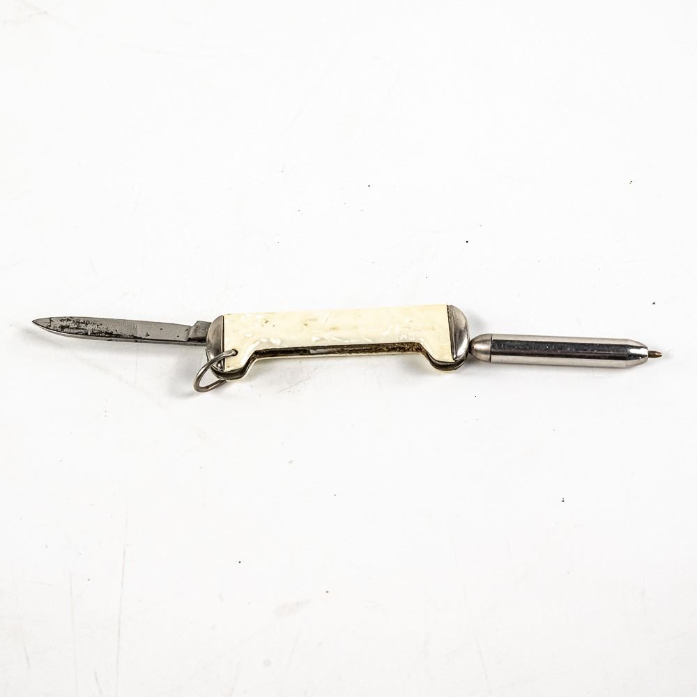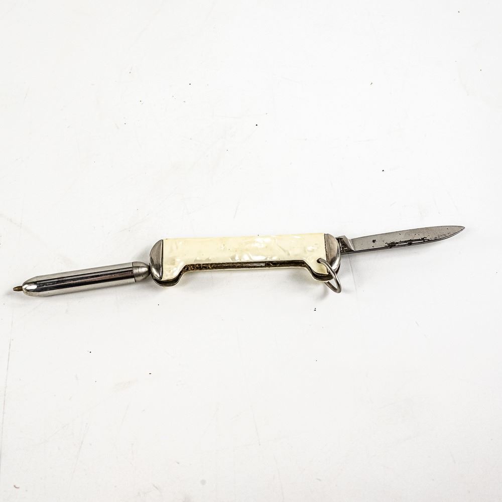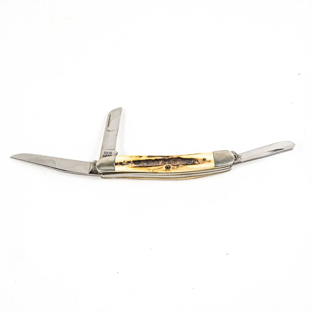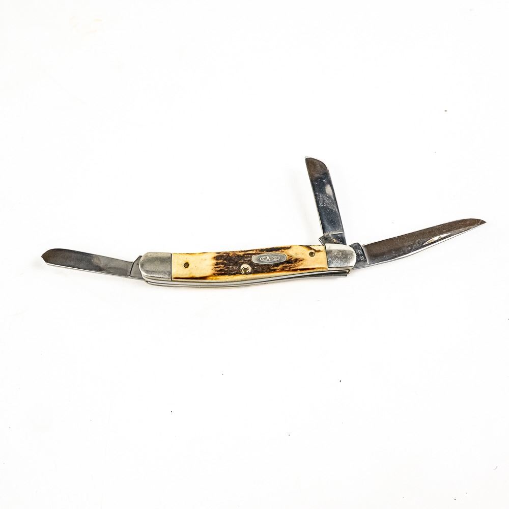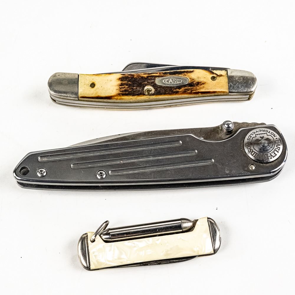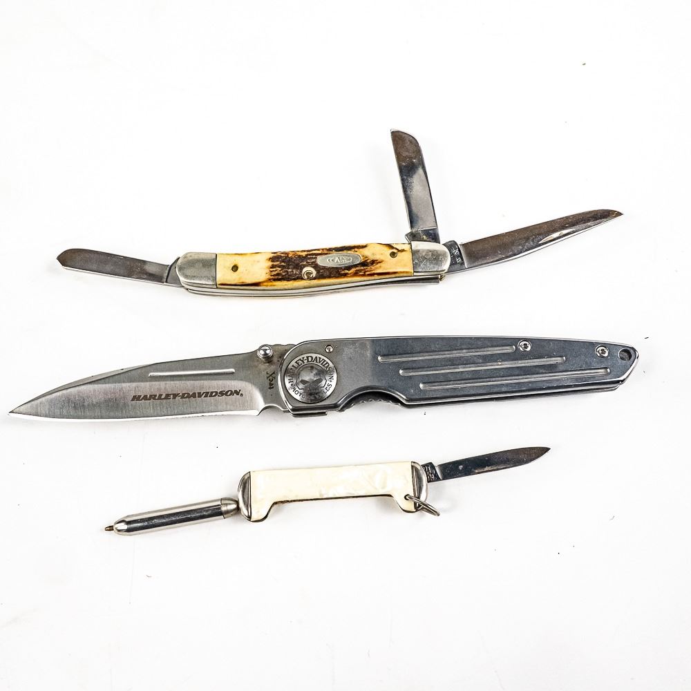 1 Case XX USA brand model 5318 (1986) 3 blade whittler knife, 1 Case Tec X brand TKW Harley Davidson branded large folding knife. Both Case knives are like new with only storage wear. Lot also includes antique Imperial USA made pocket knife with interesting ballpoint pen that still works and pearlescent handles. 2.2-4.5" closed length. Interesting variety of US made knives.See photos.