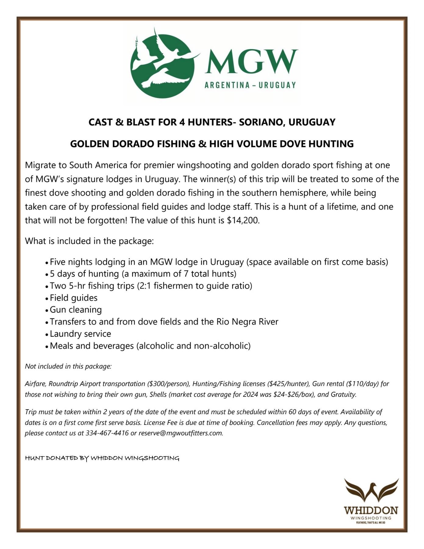Migrate to South America for premier wingshooting and golden dorado sport fishing at one of MGW’s signature lodges in Uruguay. The winner(s) of this trip will be treated to some of the finest dove shooting and golden dorado fishing in the southern hemisphere, while being taken care of by professional field guides and lodge staff. This is a hunt of a lifetime, and one that will not be forgotten! The value of this hunt is $14,200.