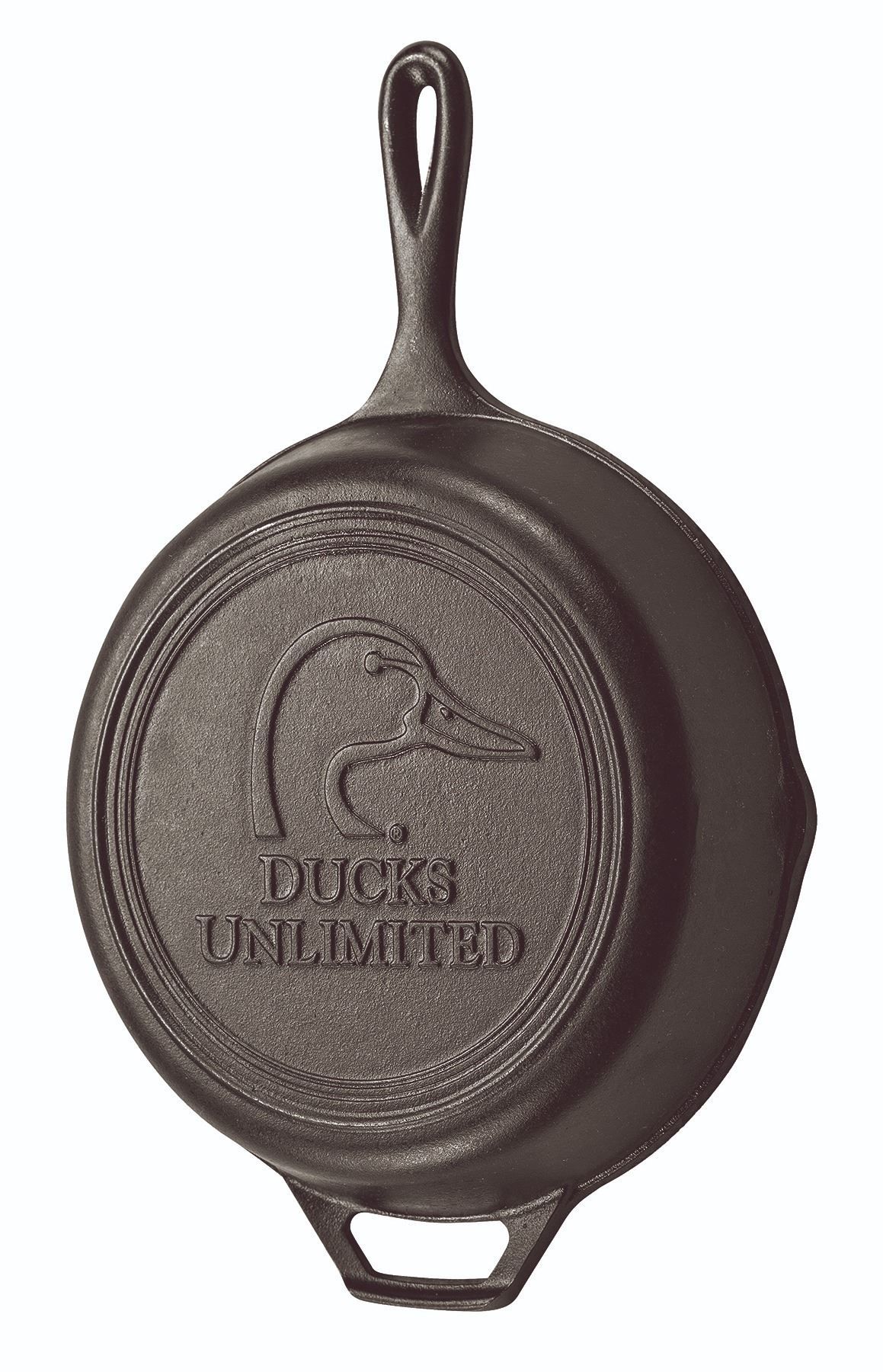 This 10.25” seasoned cast iron skillet features an assist handle and a raised Ducks Unlimited logo on the bottom. It is manufactured by Lodge Cast Iron, a company that has been manufacturing cookware since 1896. Proudly made in the USA.