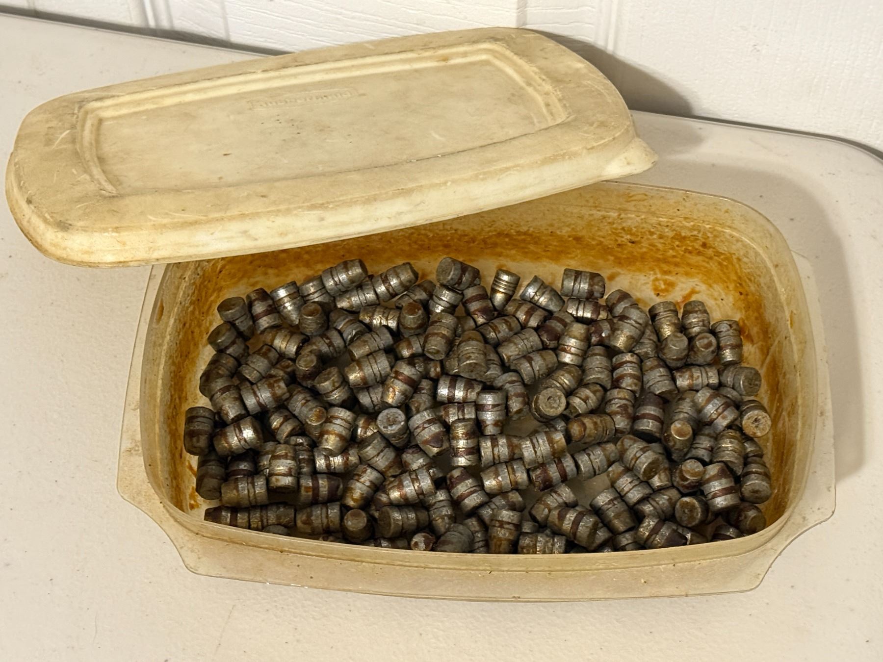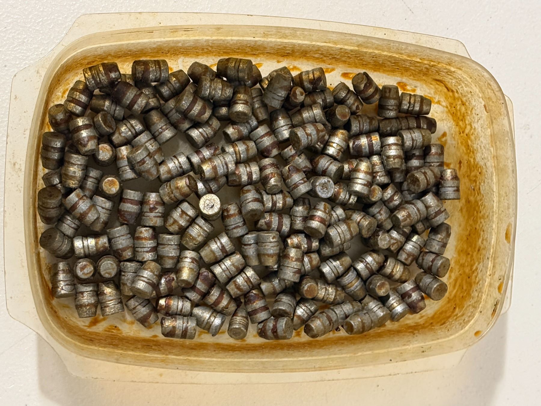 Lot of approximately 200 cast lead bullets. Mixed condition with surface oxidation as shown. Caliber unspecified. Sold as-is.