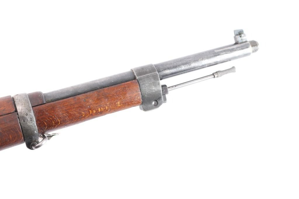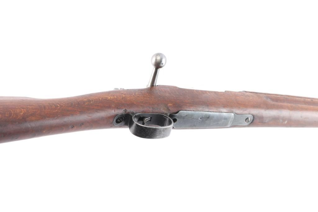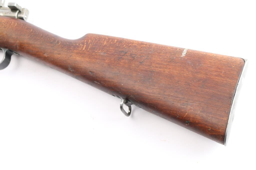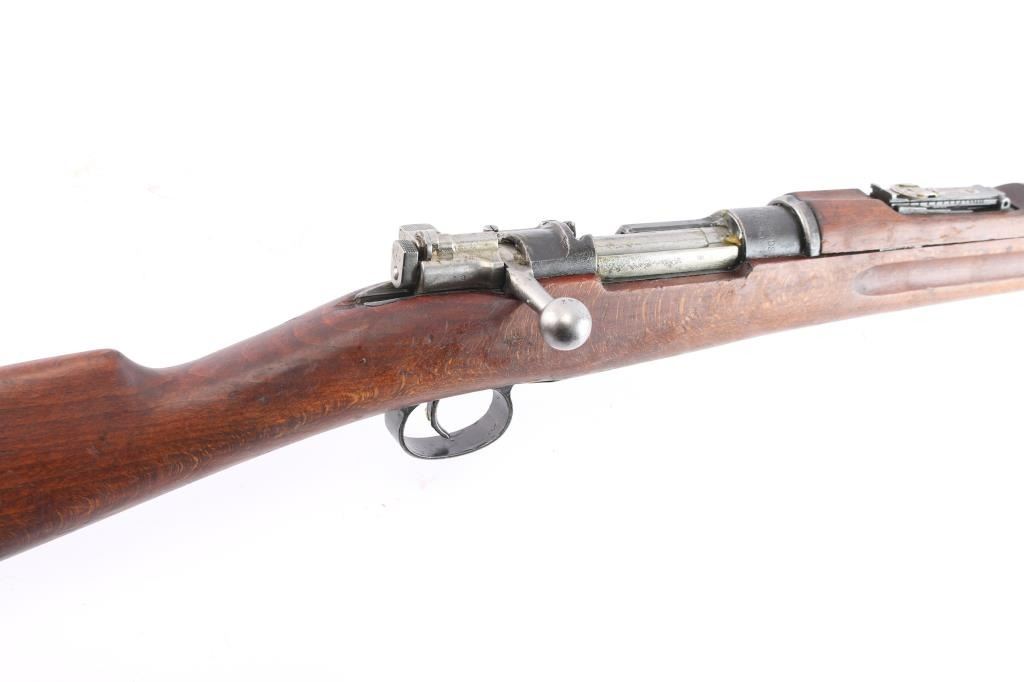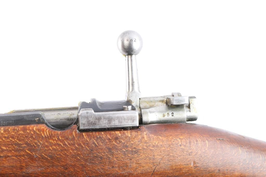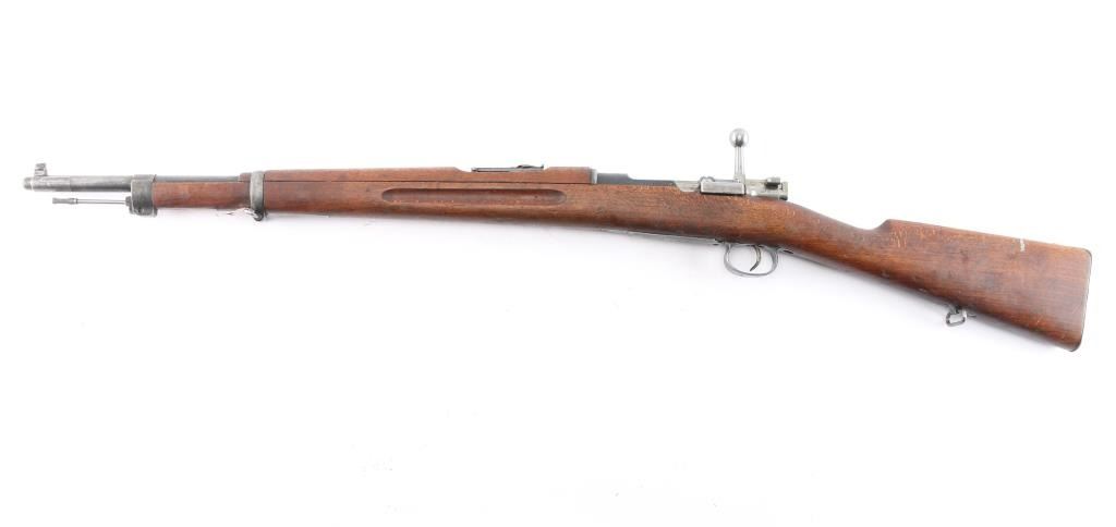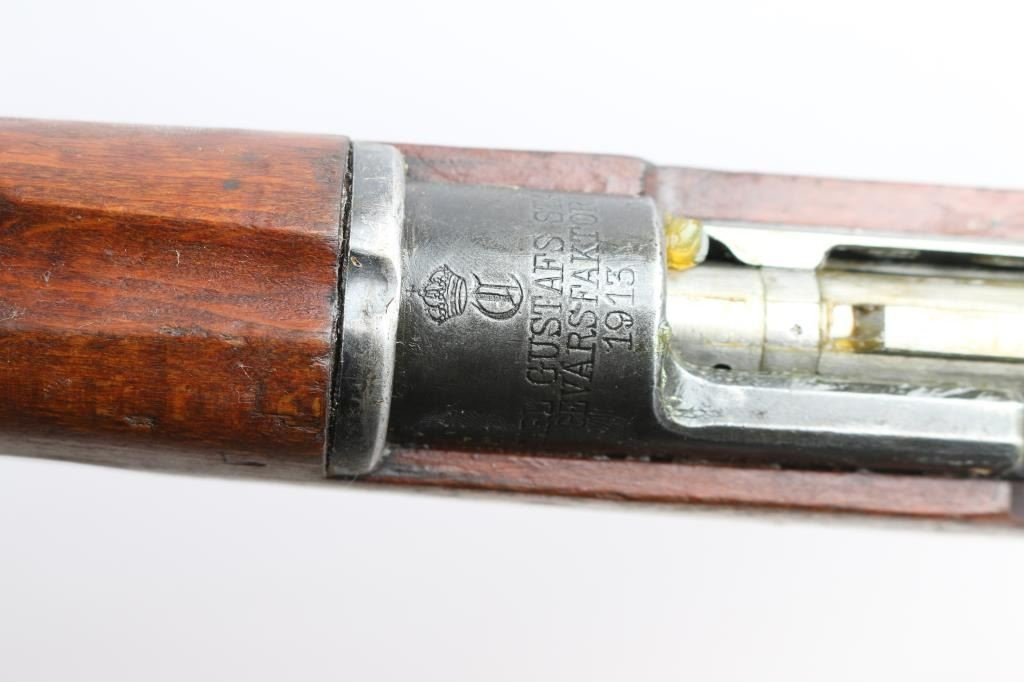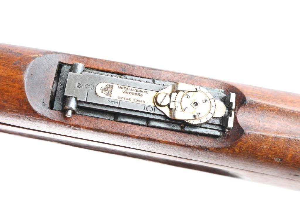 Swedish military "Mauser style" bolt action rifle, manufactured circa 1913, imported by CAI, St Albans VT. Features blued finish with polished in-the-white bolt assembly, curved smooth trigger, straight gripped wood stock with finger grooves in forend, flat steel buttplate, 24" barrel, cleaning rod, bayonet lug, inverted "V" front sight, Vasteras type rear sight, straight bolt handle, manual safety, and sling swivels. Muzzle is threaded. Bore condition cannot be determined because it is full of cosmoline. Retains 50% of its blued finish, metal shows handling wear on edges, corners, and along barrel. Bolt is very good clean condition. Stock is good condition with handling marks, tape residue on top of stock, and brass disc on right side of stock marked with a 1 holdover and 3 barrel condition. All observed numbered parts match.