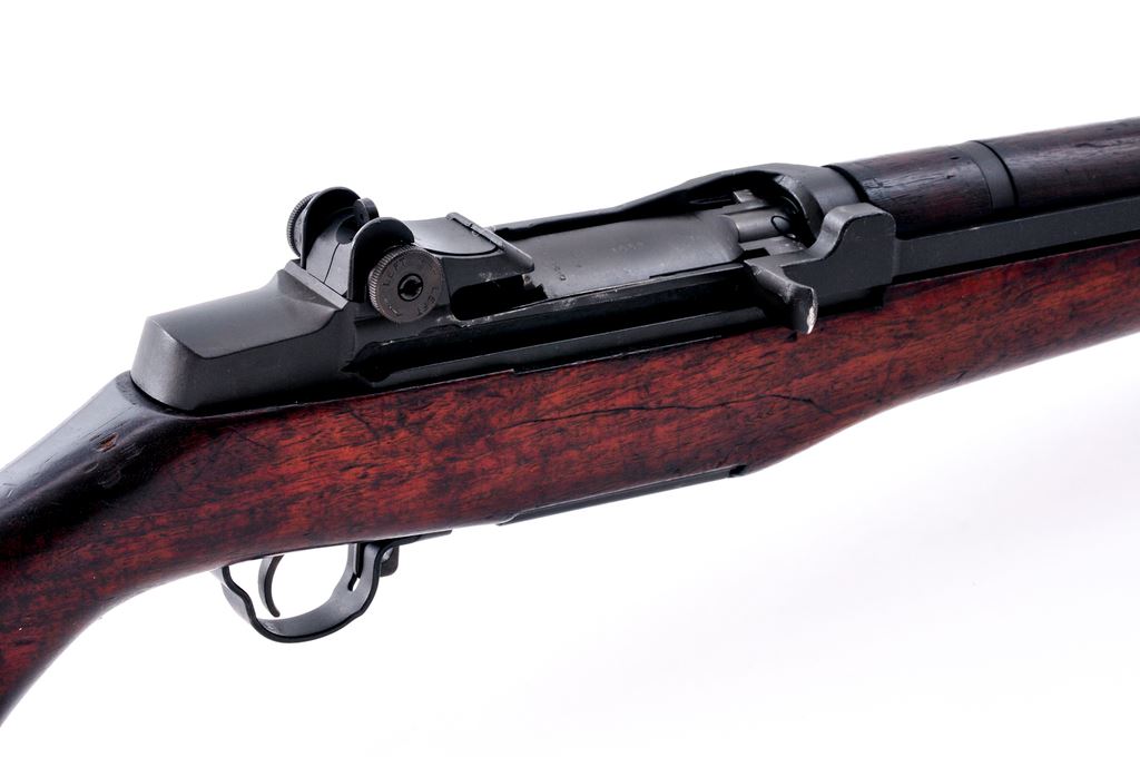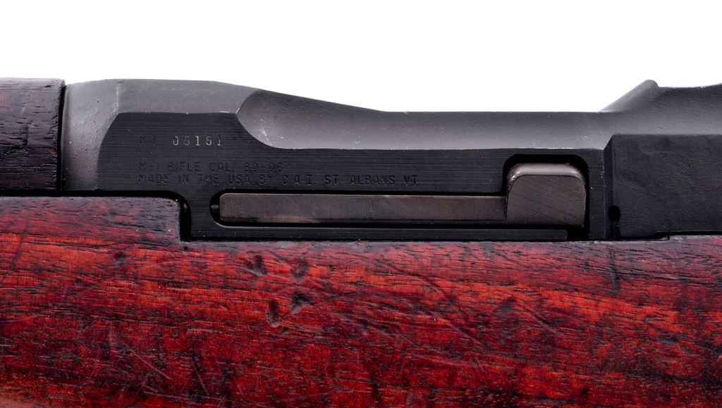 Century Arms M1 Garand Semi-Automatic Rifle, #05151, .30-06 cal., 24'' barrel, parkerized finish, walnut stock, blade front sight with protecting ears and adjustable aperture rear sight. Marked on left side of receiver ''M1 RIFLE CAL 30-06 MADE IN THE USA BY C.A.I. ST ALBANS VT.'' Danish produced barrel is stamped ''(crown)/VAR/5-57''. Stock is stamped with a boxed ''S.A./E'' cartouche on left side of buttstock and has a later Danish ''HTK'' sticker in the barrel channel. There is ''P'' firing proof on the underside of the wrist and a mismatched serial number stamped on the underside of the butt. Bottom of the wrist has been drilled possibly for a disc which has been removed. Trigger group and hammer are ''SA'' stamped. ''BMB'' stamped on top of bolt. Condition overall is very good with approx. 95% finish remaining on the metal with thinning on top of barrel. Wood has an even color and is in very good condition with a notable scratch on the right side and overall light handling marks. Action is smooth, bright bore is excellent with sharp rifling. Est.: $600-$900. (Modern)(Joe Poyer collection)