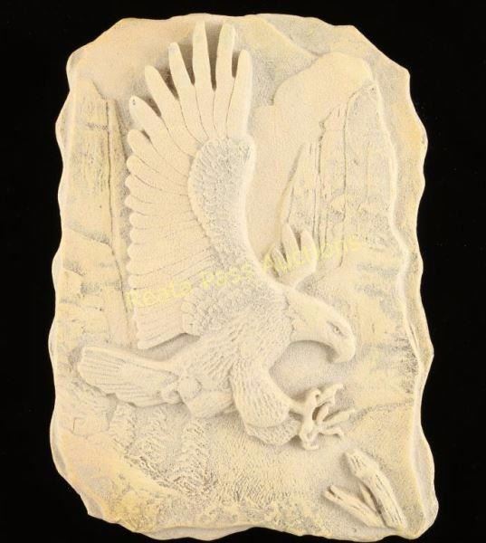 Flying eagle with talons out with rocky cliffs in the background. 'Boulder Creek Design Alliance' on back. Measures 14 1/2"x10 1/2".