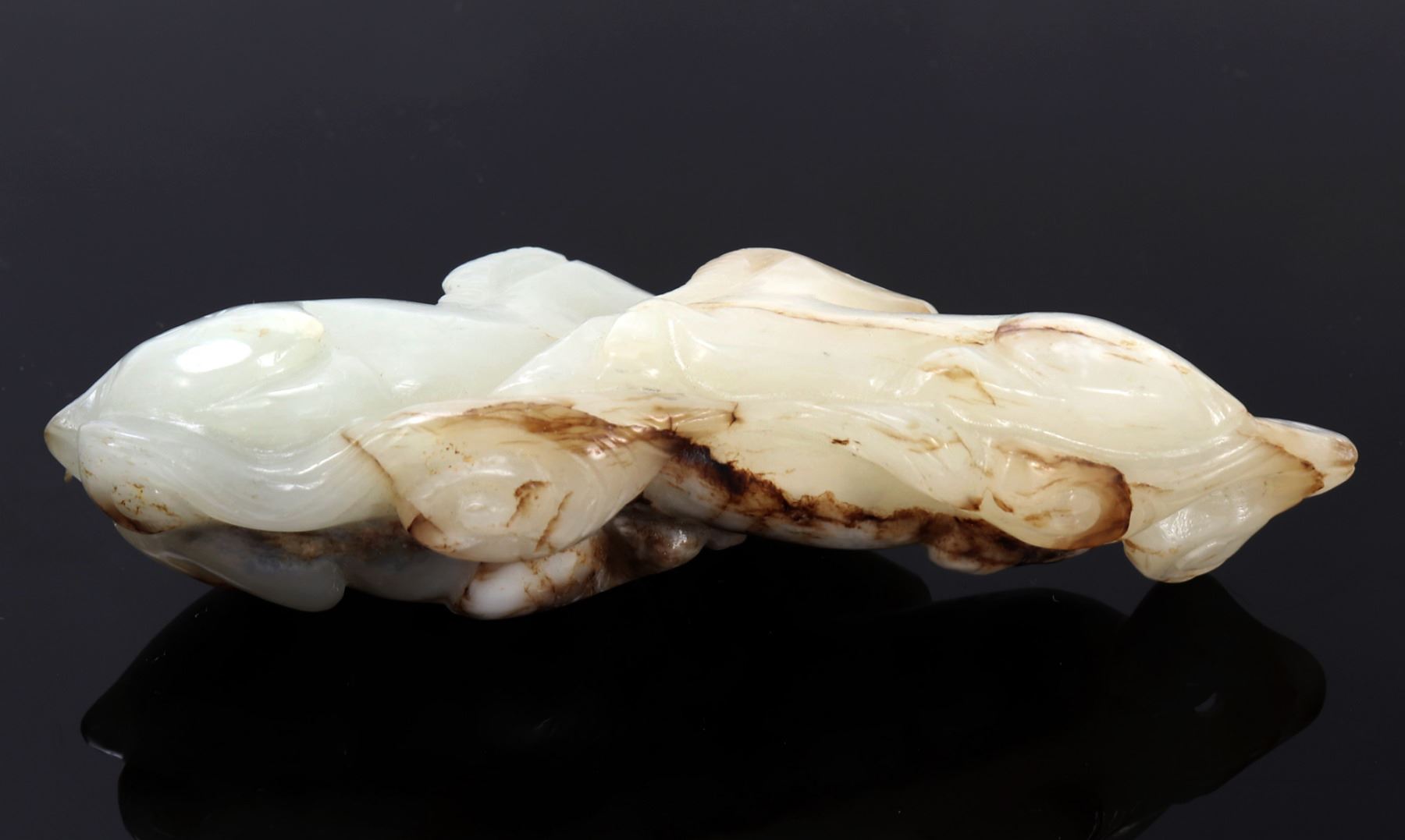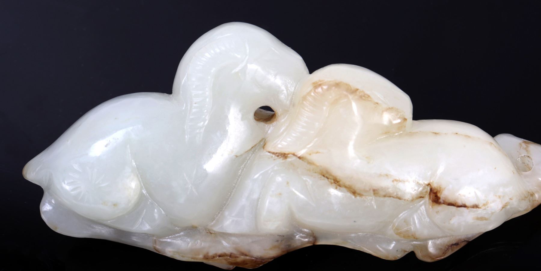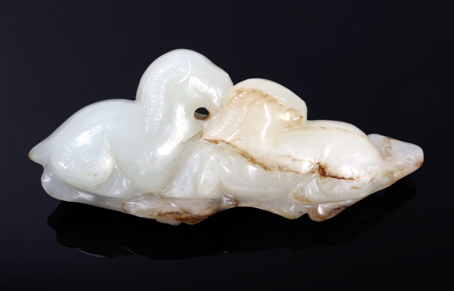 Chinese certified nephrite jade pendant in the shape of recumbent rams. Beautiful light green to a marble white jade. Incised stars to the bodies of each ram with long horns. Pierced to the middle for suspension. Size 3 3/4" L, weight 92 g. Condition: Good overall condition with one small chip to a leaf.