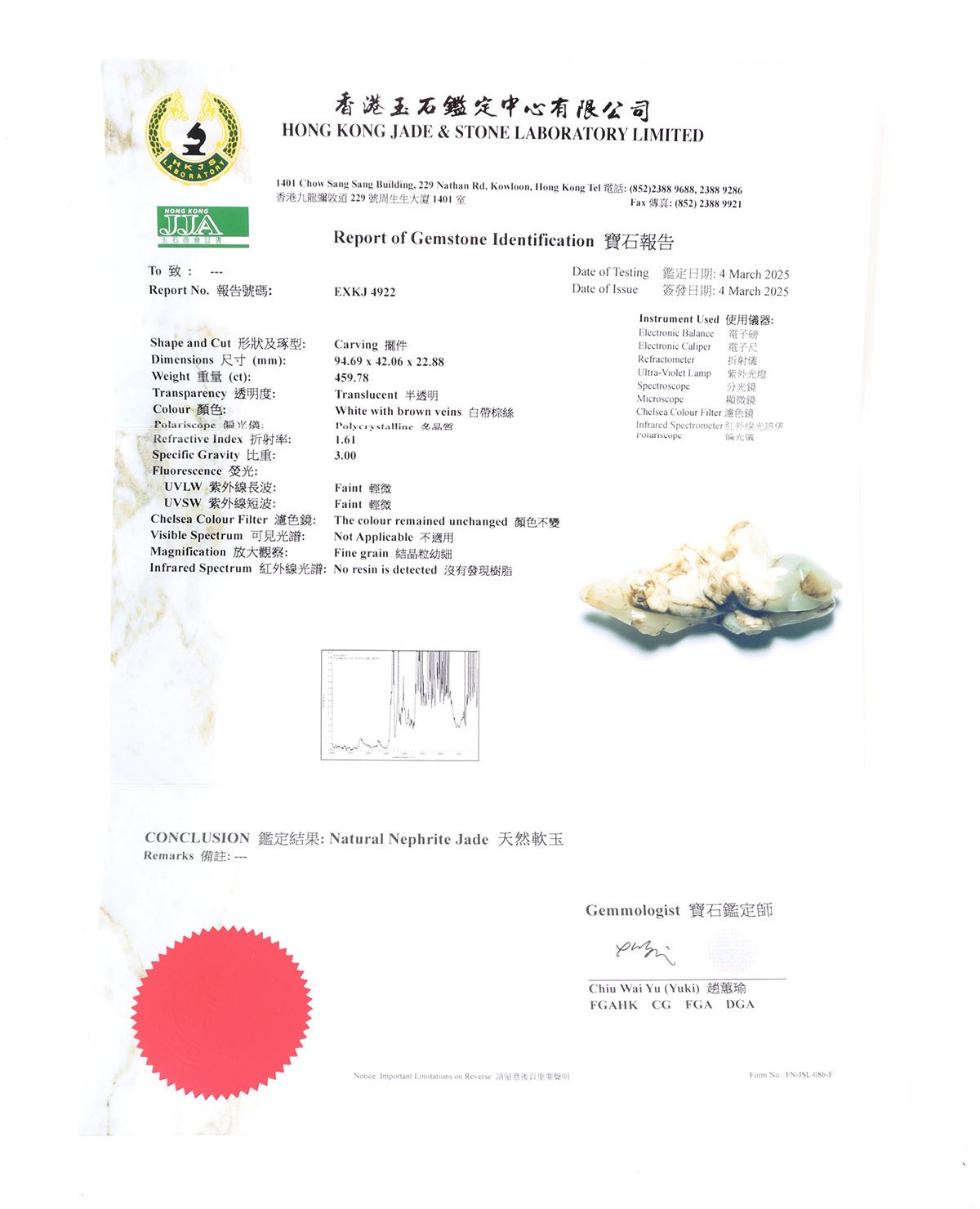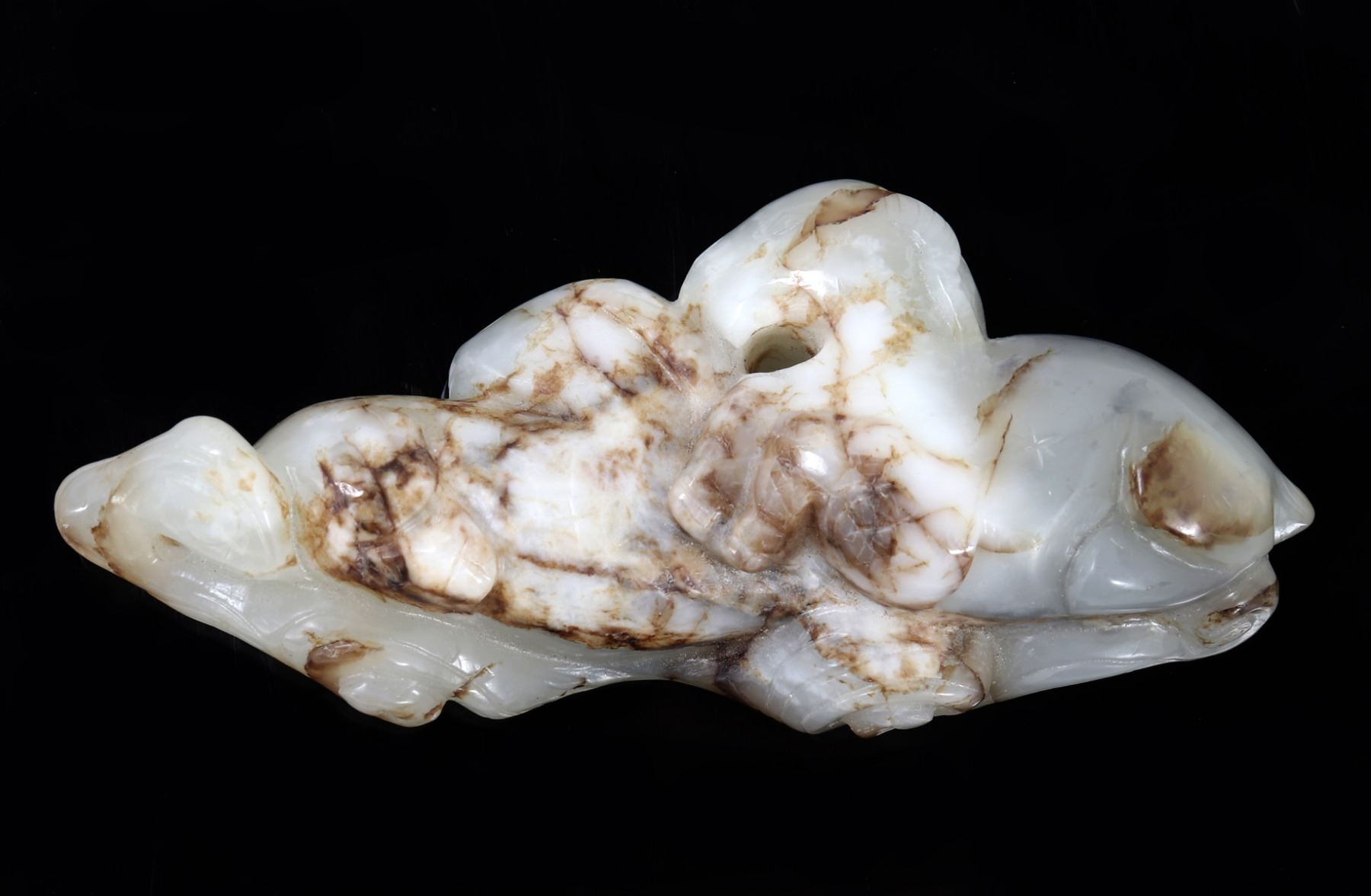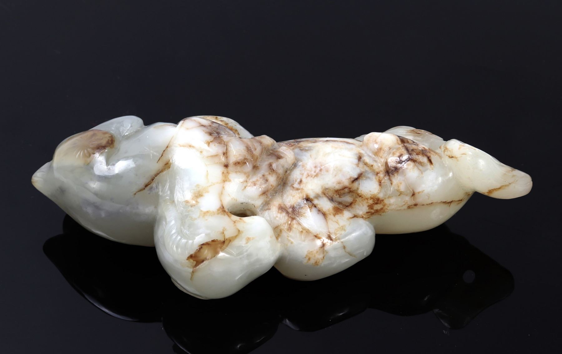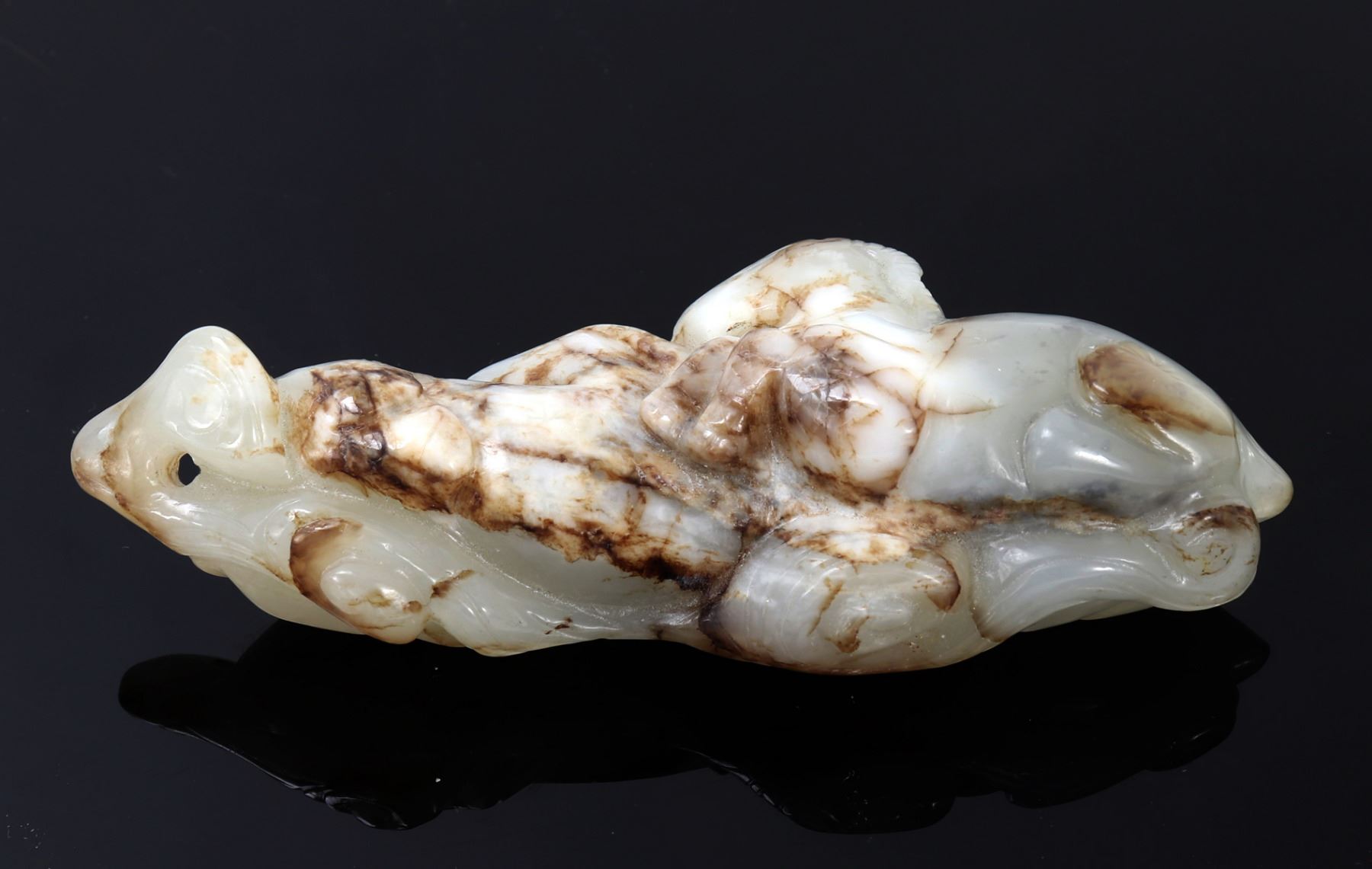 Chinese certified nephrite jade pendant in the shape of recumbent rams. Beautiful light green to a marble white jade. Incised stars to the bodies of each ram with long horns. Pierced to the middle for suspension. Size 3 3/4" L, weight 92 g. Condition: Good overall condition with one small chip to a leaf.