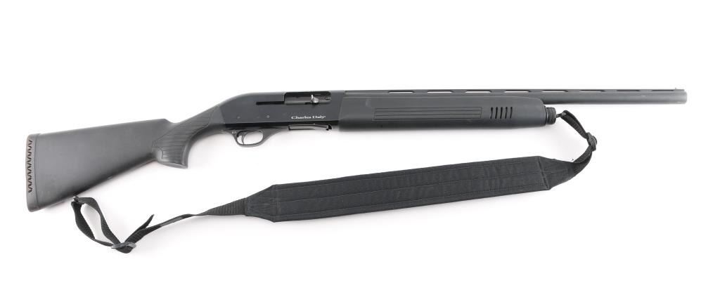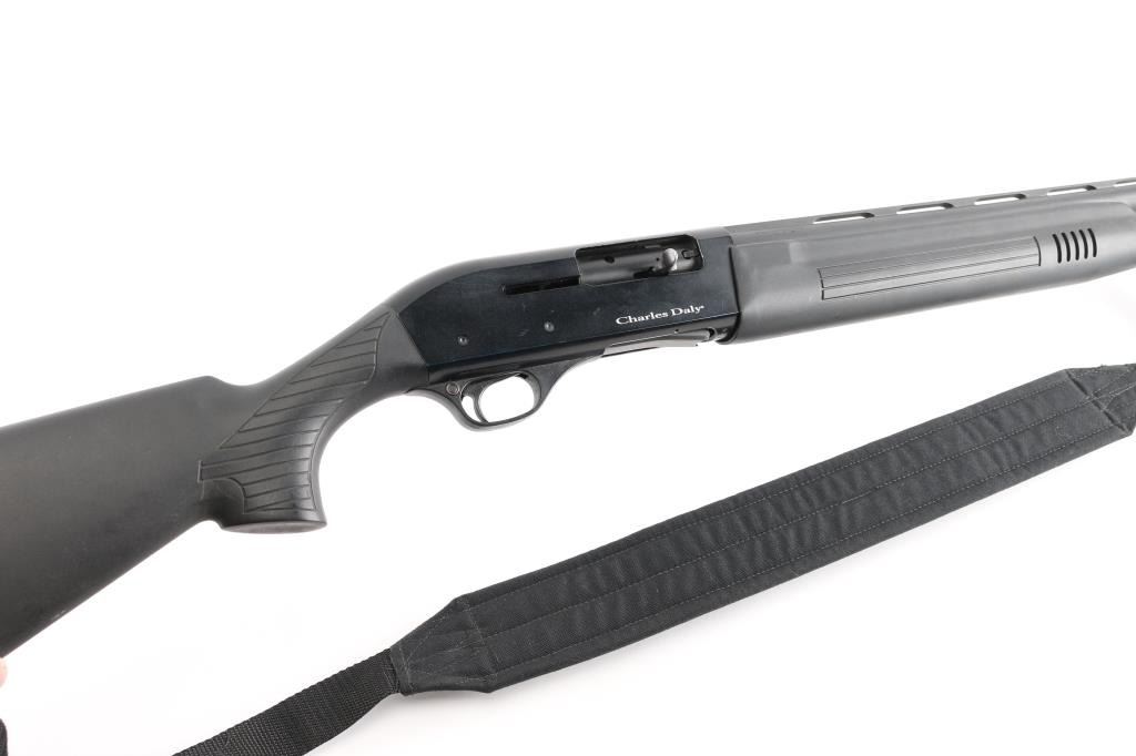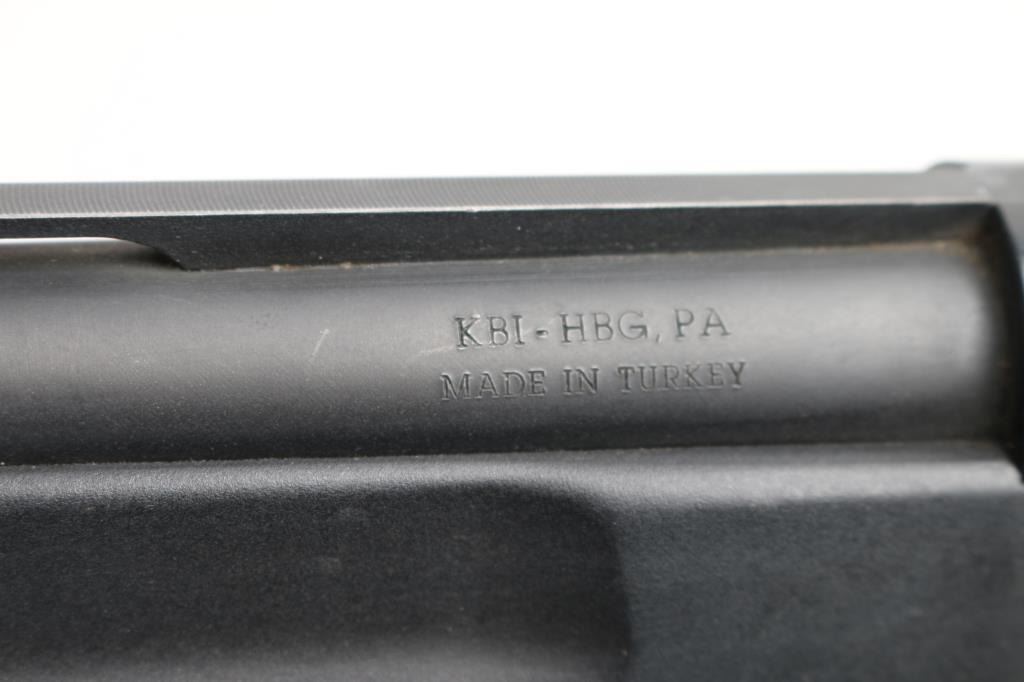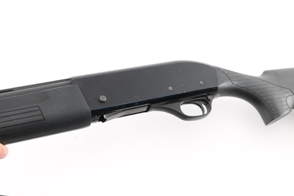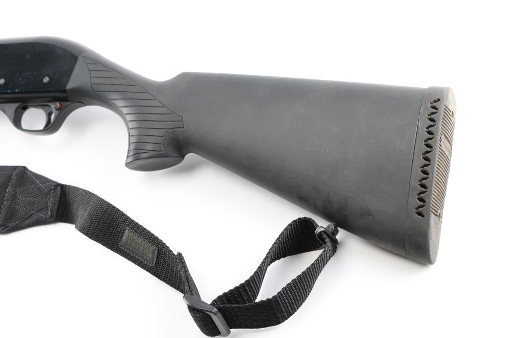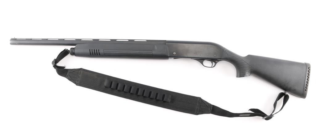 Gas operated semi-automatic 12 Gauge shotgun, chambered for 3" shells, made in Turkey. Features a blued finish 24" vent ribbed barrel with a brass bead front sight, polymer shoulder stock with vented rubber buttpad and vented slide forearm. Curved trigger with plastic trigger guard and push button safety. Retains approximately 85% blued finish with minor scratches, marring and edge wear. Bore is clean and bright. Comes with a MODIFIED choke tube, installed and a ten shell carrier nylon padded sling.