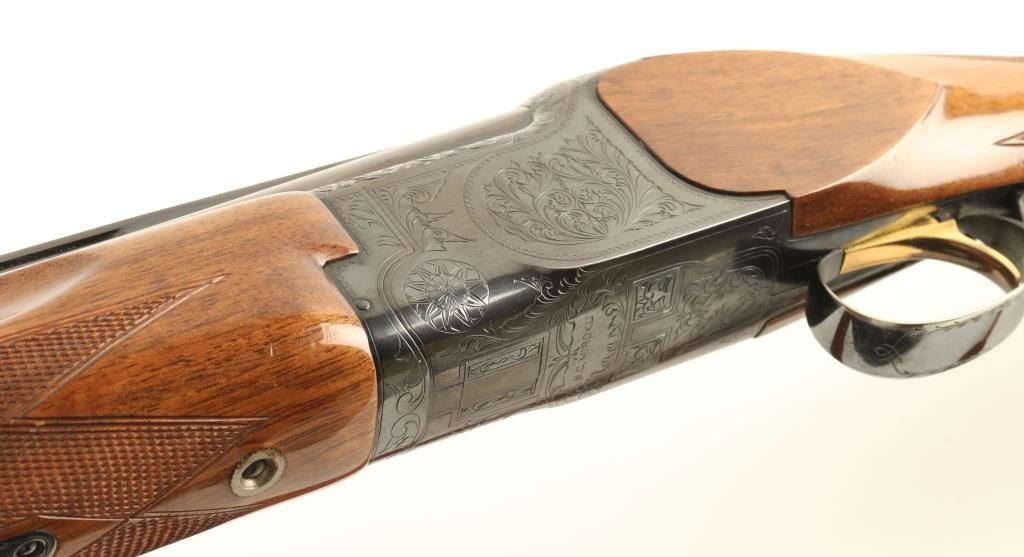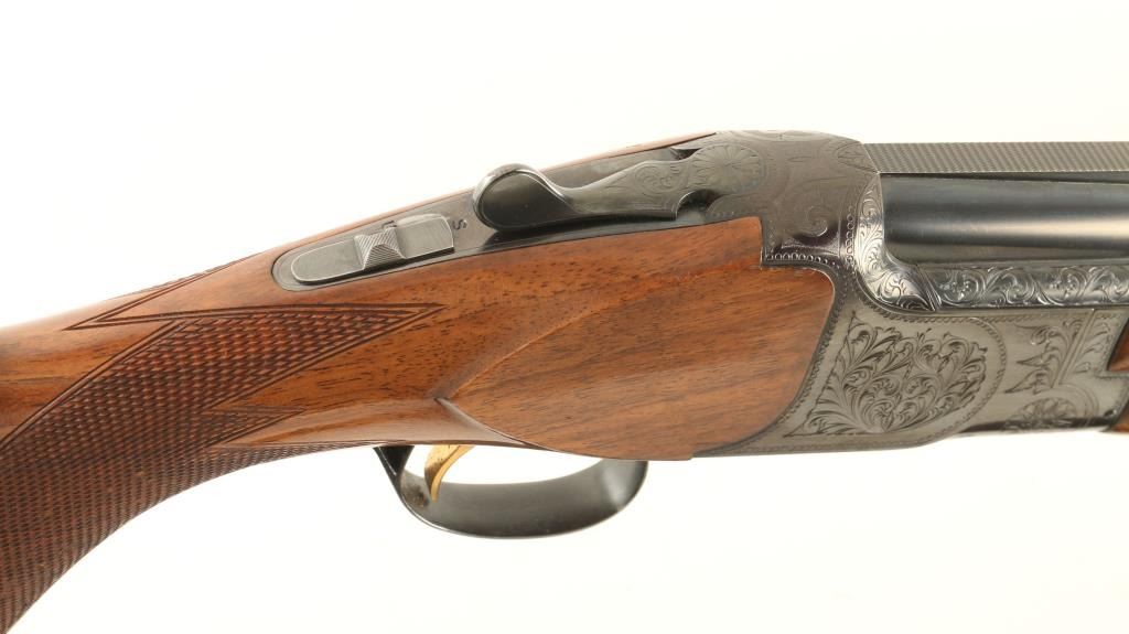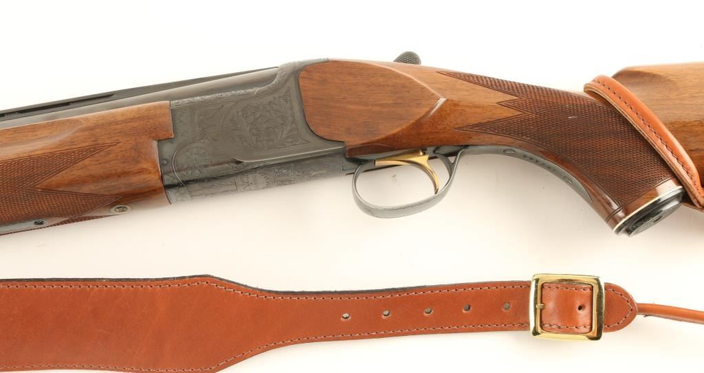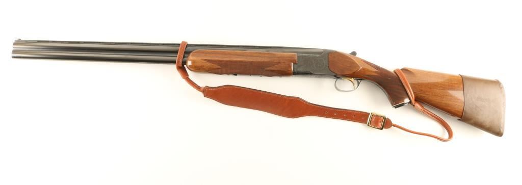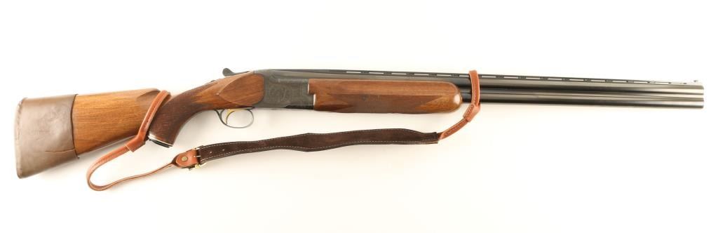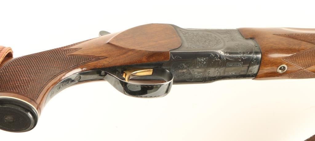 Quality Japanese made under & over shotgun chambered for 2 3/4" 12 gauge shells, manufactured by Miroku. Features a blued finish, 28" vent ribbed barrels with full/modified chokes, auto ejectors, brass bead front sight with removed mid sight, leather sling, full coverage scroll engraved receiver, single gold trigger, sliding tang safety/selector, checkered walnut forend and pistol grip shoulder stock with slip-over recoil pad. Shotgun exhibits approximately 95% of it's blued finish with some light edge wear, finish loss from where the forend rubs on the barrel and some losses between the two barrels including what looks like light surface rust. Action is smooth, bores are bright and wood stocks are fine. Condition is very good++. ***Modern Firearm***