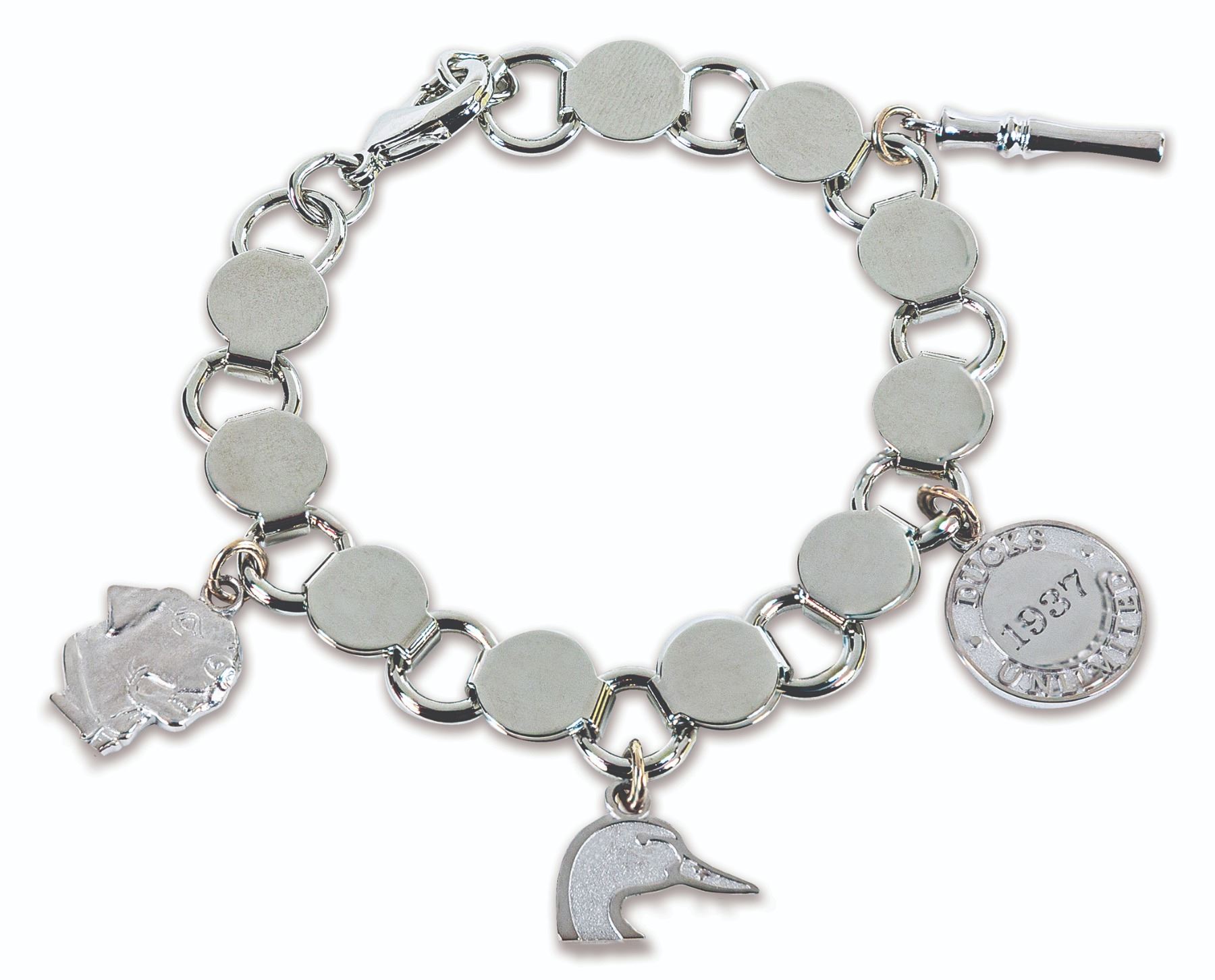 This beautiful sterling silver charm bracelet will never go out of style. The 7” round link chain bracelet features four custom charms: a lab, a DU logo, a Ducks Unlimited 1937 disc, and a duck call. It is secured with a lobster claw clasp. Proudly made in the USA.