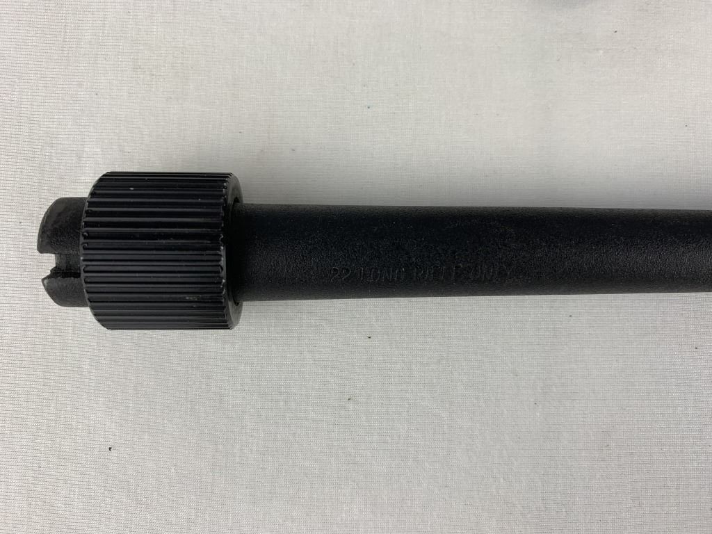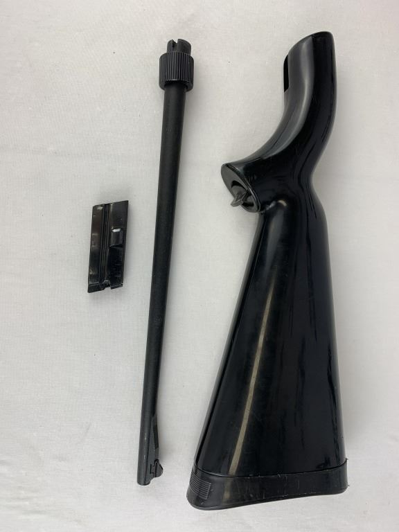 This gun breaks down and comes with 1 Magazine, Static Ramp Front sight and Static Rear Sight, Hollow Plastic Stock. Fun range day gun or emergency camping protection. Please see photos