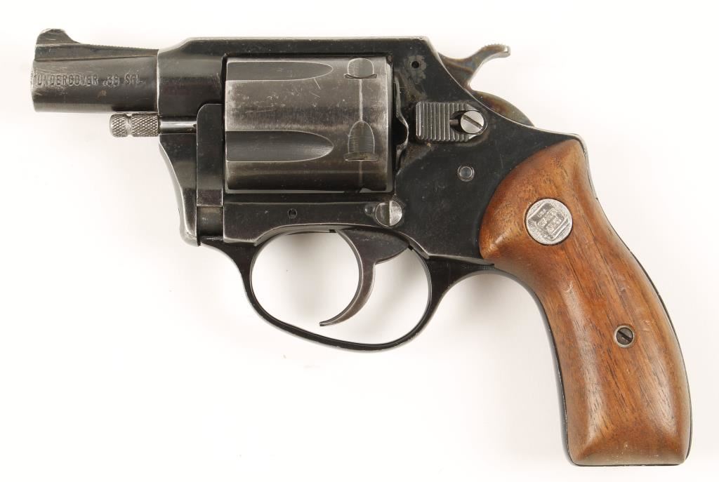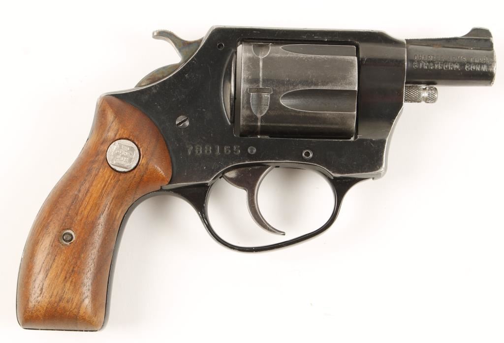Blued double-action 5-shot revolver with a 2" barrel. Finish has edge and high point wear with a drag line. Case colored hammer is very colorful. Bore and chambers are in good shape. There is no extractor star so the pistol doesn't work. The smooth wood grips are slightly below the frame line. Condition is good for parts.