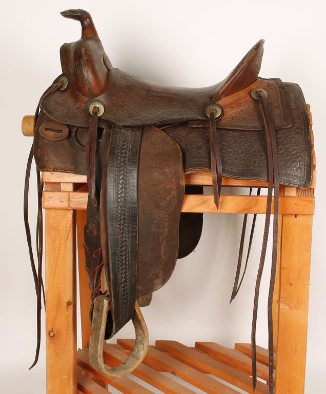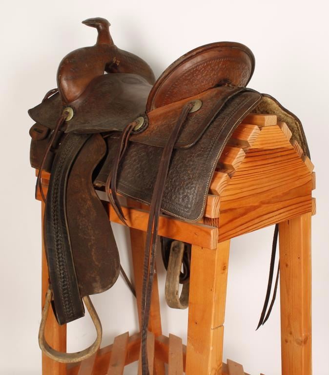 Star stamped brown leather, 1920-30's era with wooden stirrups. 15" seat, in poor condition.