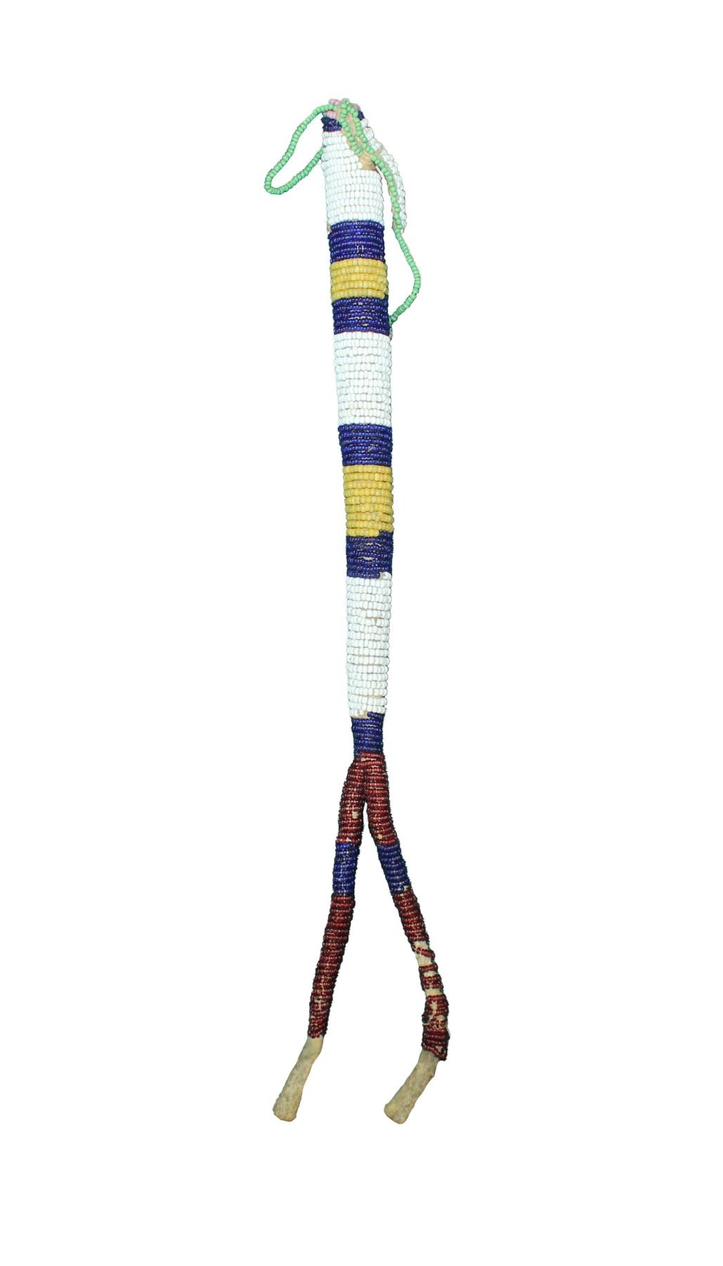 A nicely beaded Plains Indian awl case with stepped color pattern and adorned with two drops.