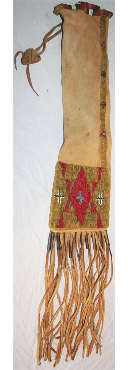 Cheyenne Beaded Pipe Bag; ca 1920, a buckskin bag geometrically beaded on one side and around the top opening. 5"x 25" in total length.