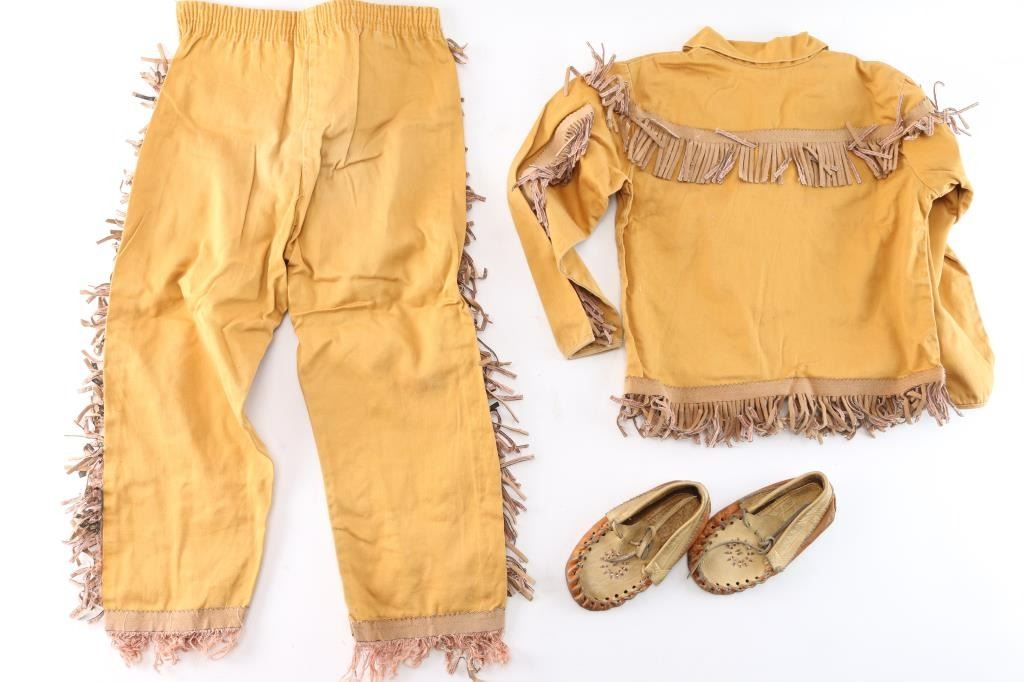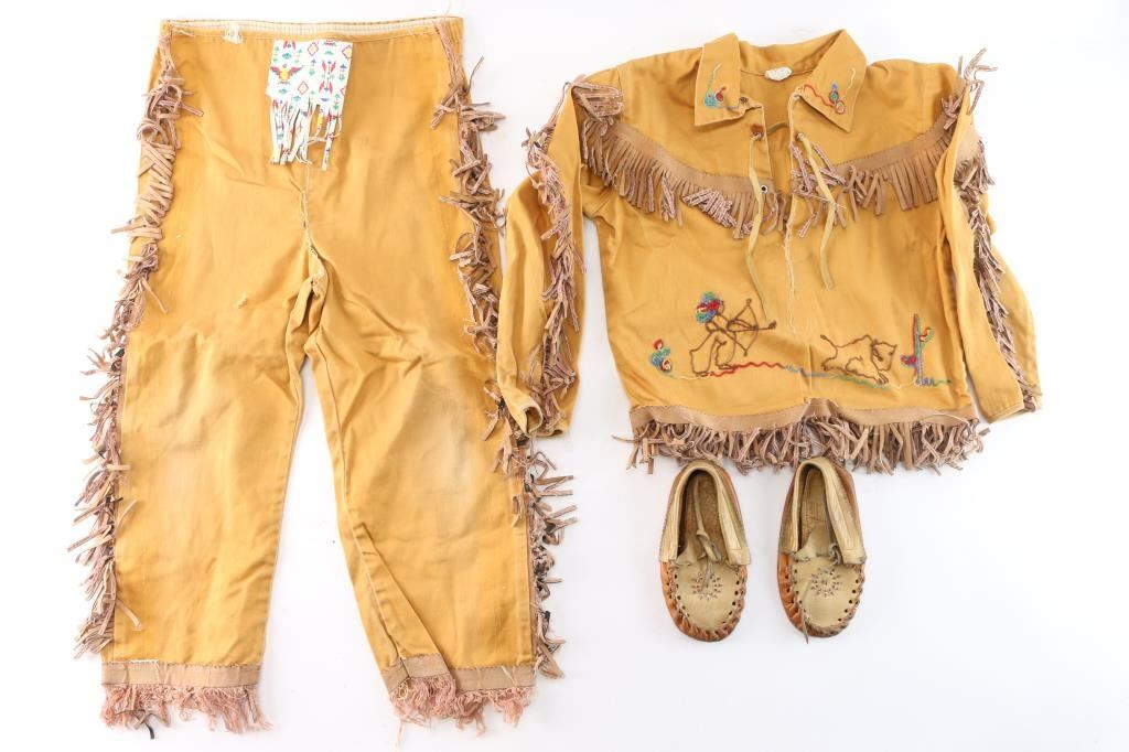 Brown cotton shirt and pants with fringe with buffalo and indian design with moccasins.