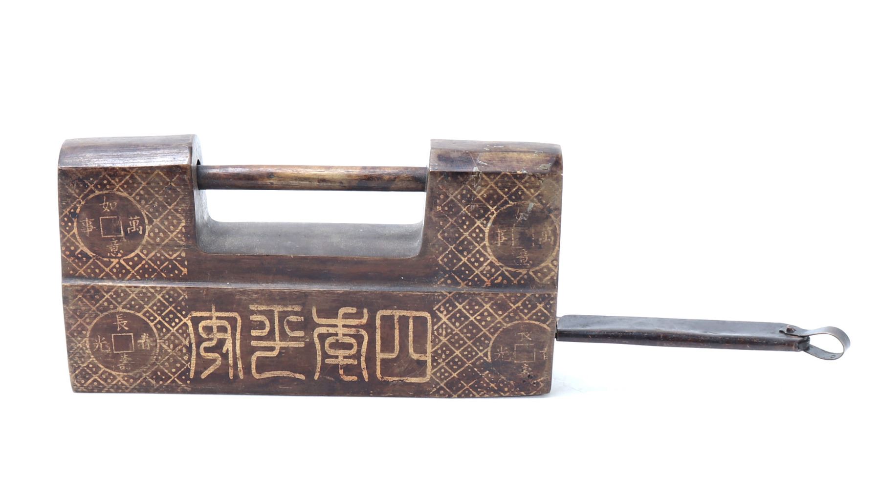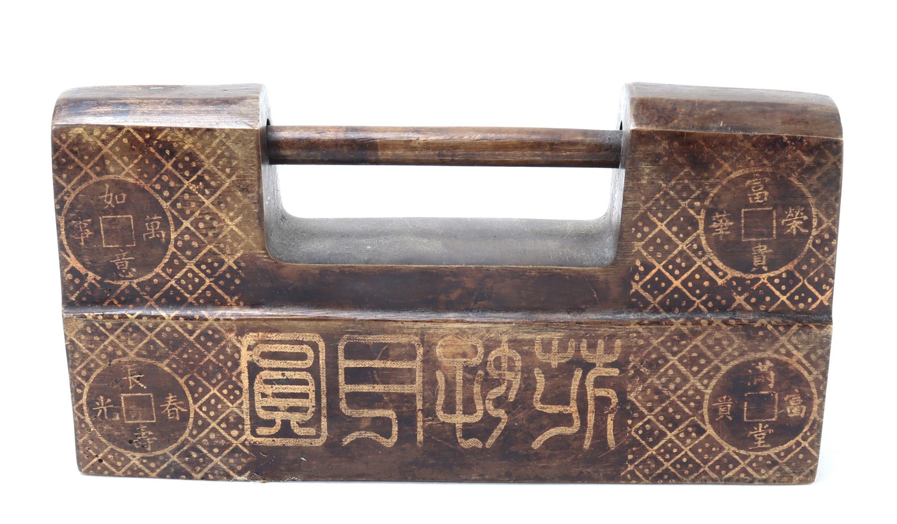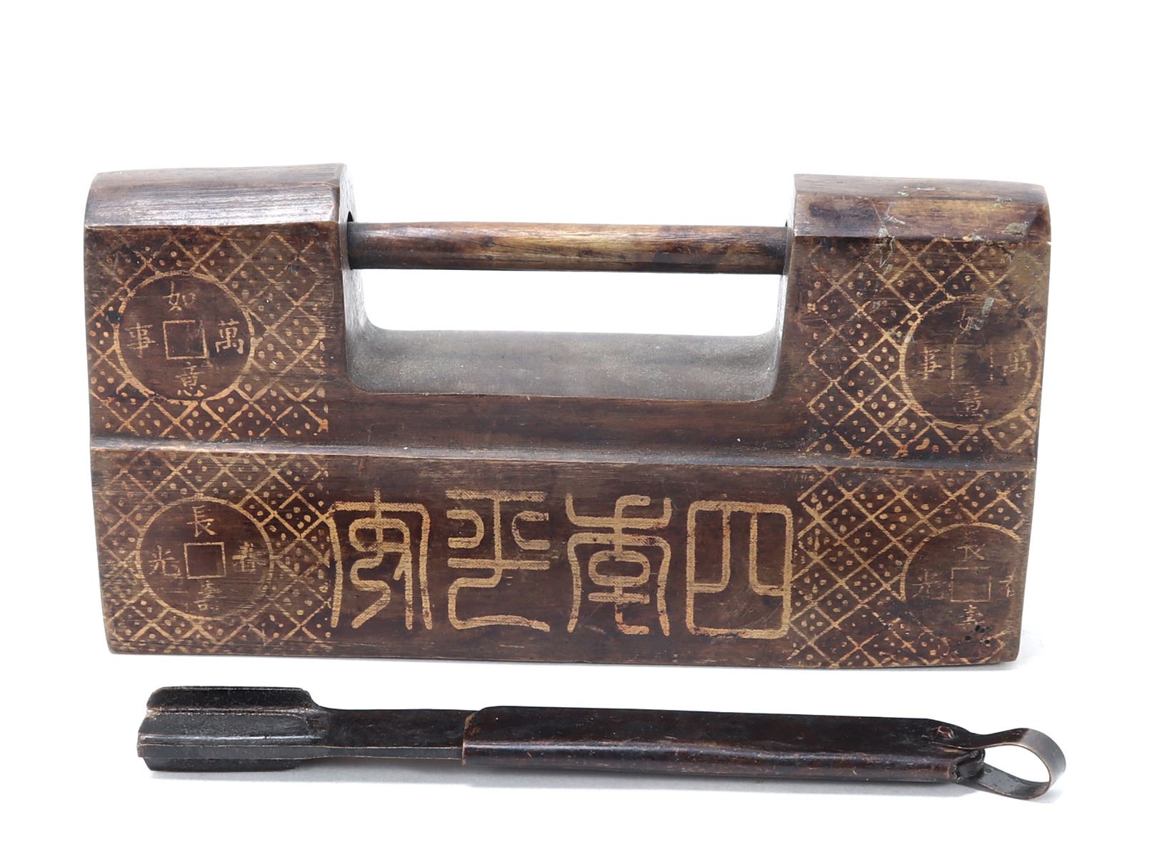 Very nice Chinese brass padlock with key. Wonderful lost wax technique emphasized with gold style details including currency and a signature or four character mark to the base. Locks like these were once used to safeguard imperial scroll cases, tea caddies, or merchant boxes. Their designs were as much about symbolism and artistry as they were about utility. Size 5 3/8" L, 8 1/4" L with key, weight 1.31 lb.. Condition: Good functioning condition throughout.