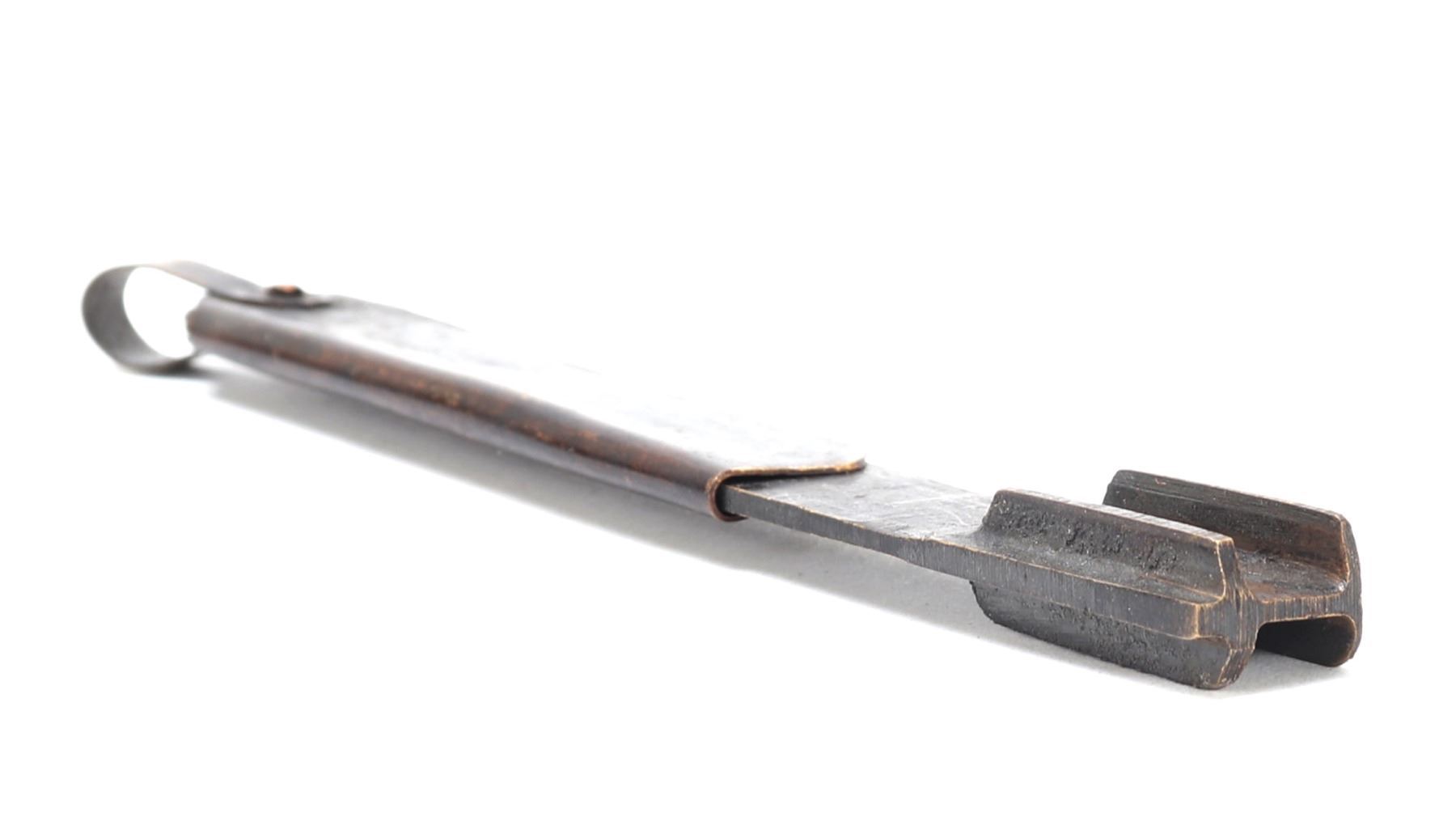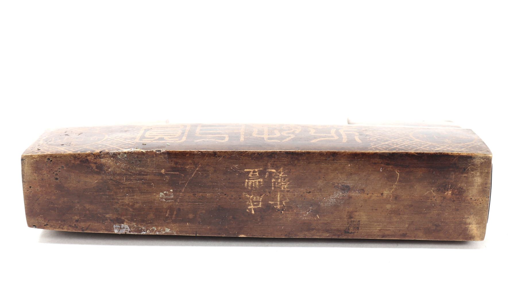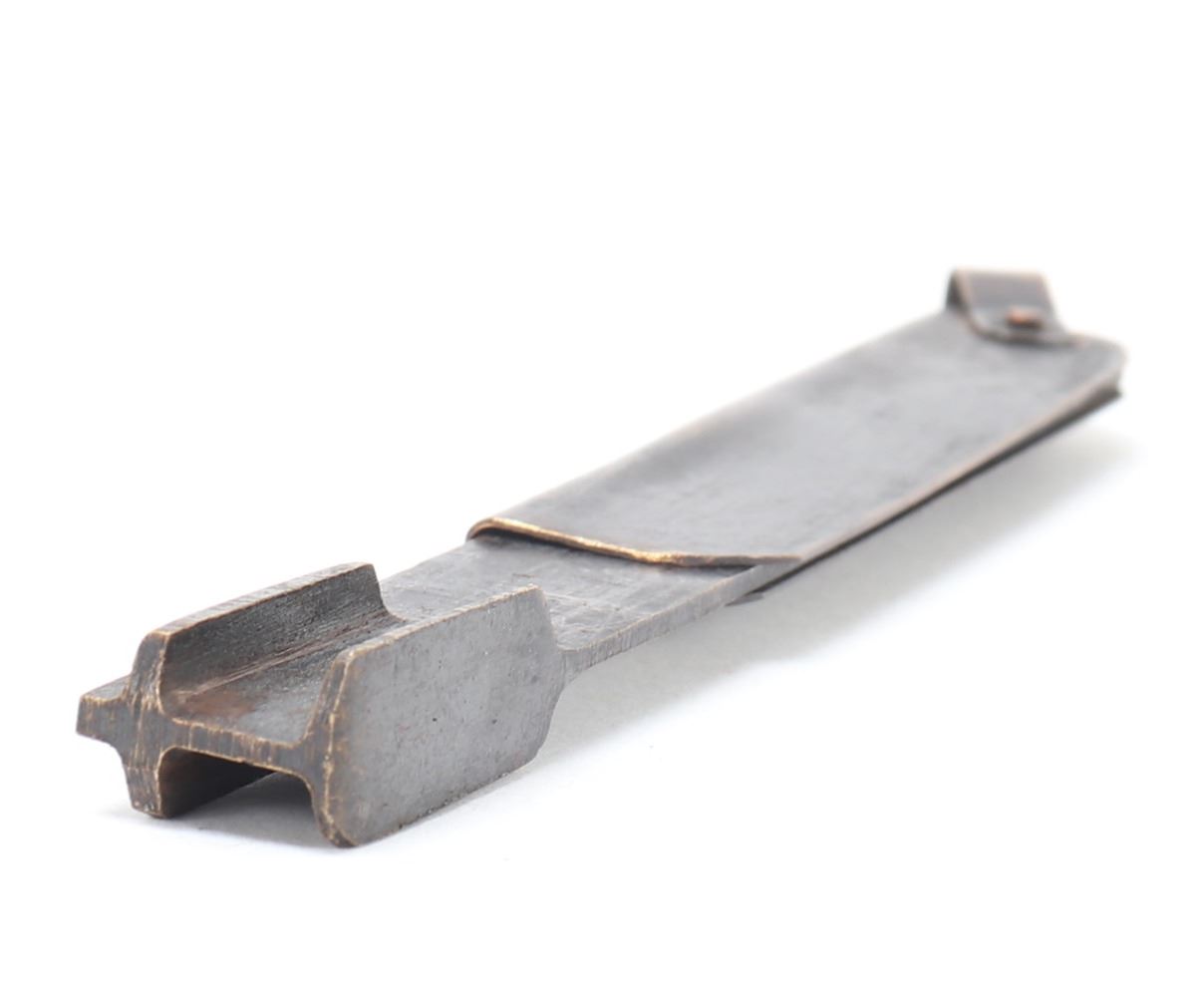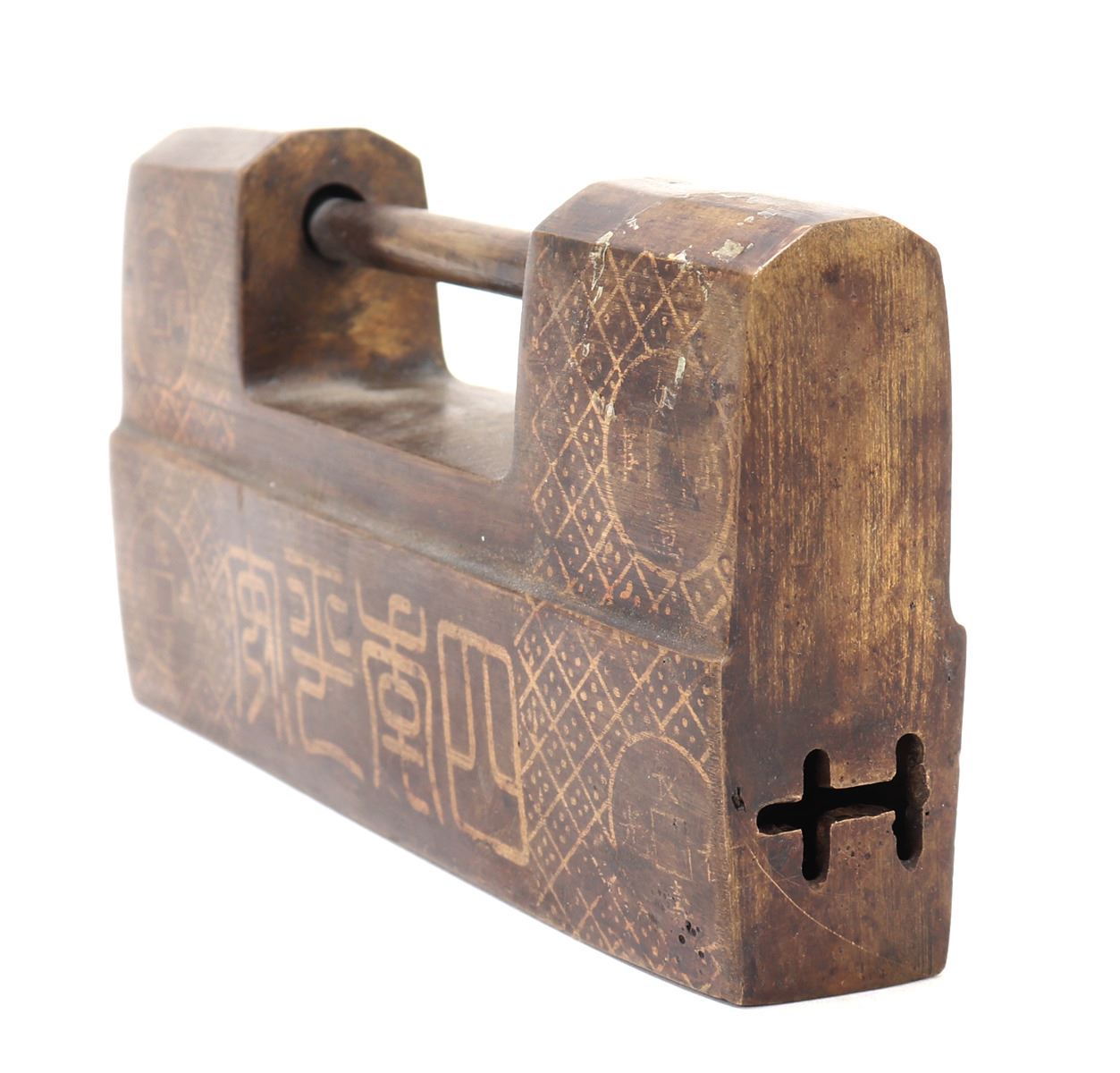 Very nice Chinese brass padlock with key. Wonderful lost wax technique emphasized with gold style details including currency and a signature or four character mark to the base. Locks like these were once used to safeguard imperial scroll cases, tea caddies, or merchant boxes. Their designs were as much about symbolism and artistry as they were about utility. Size 5 3/8" L, 8 1/4" L with key, weight 1.31 lb.. Condition: Good functioning condition throughout.