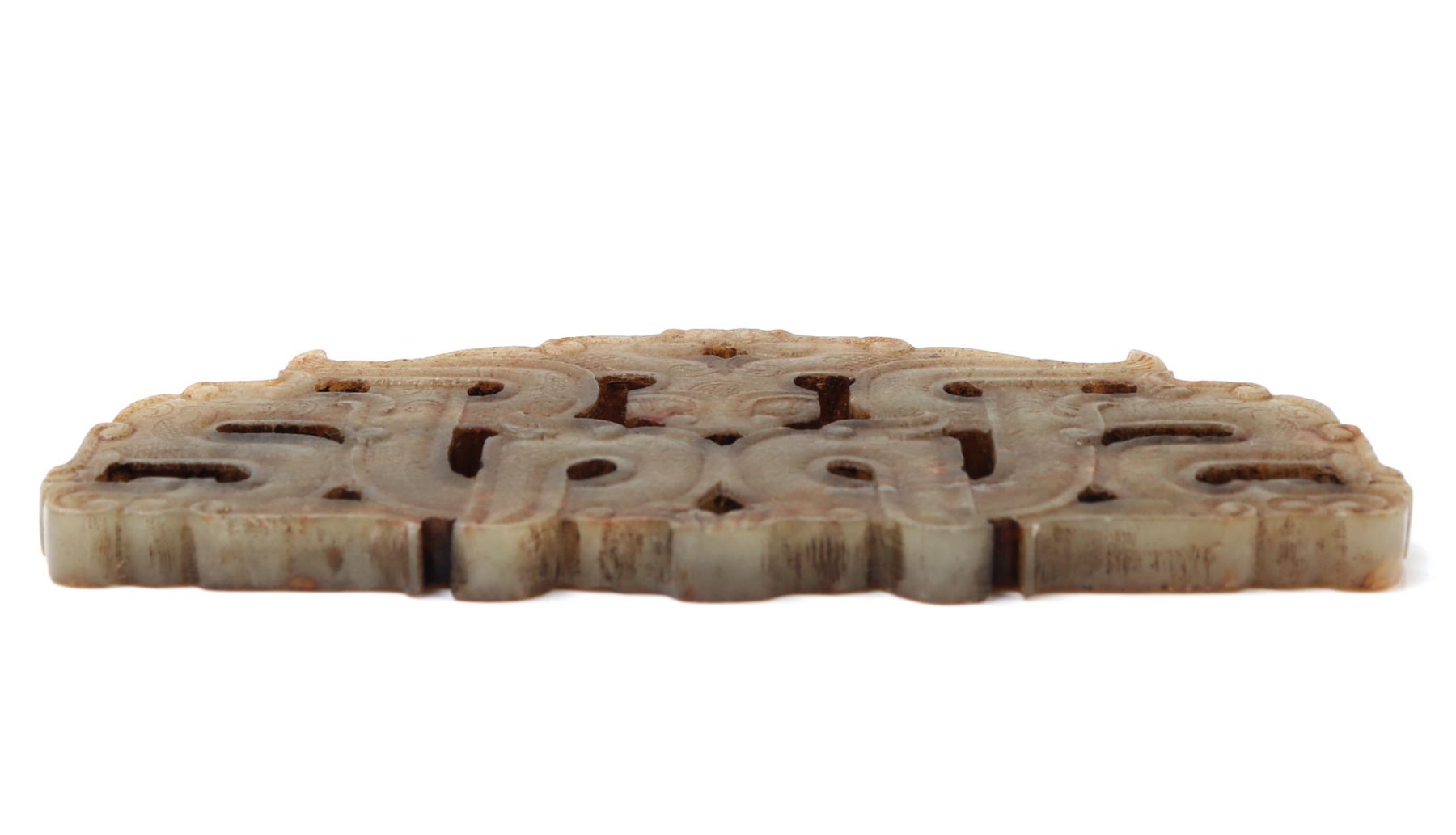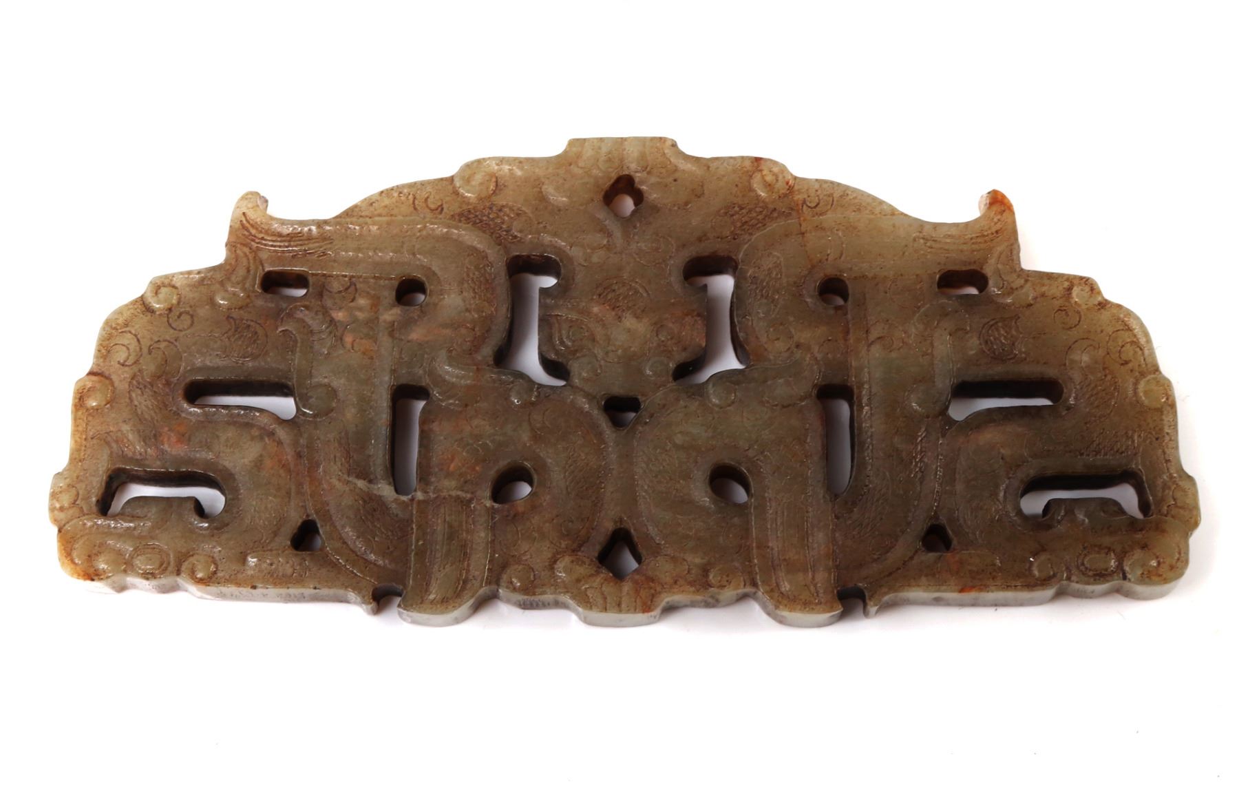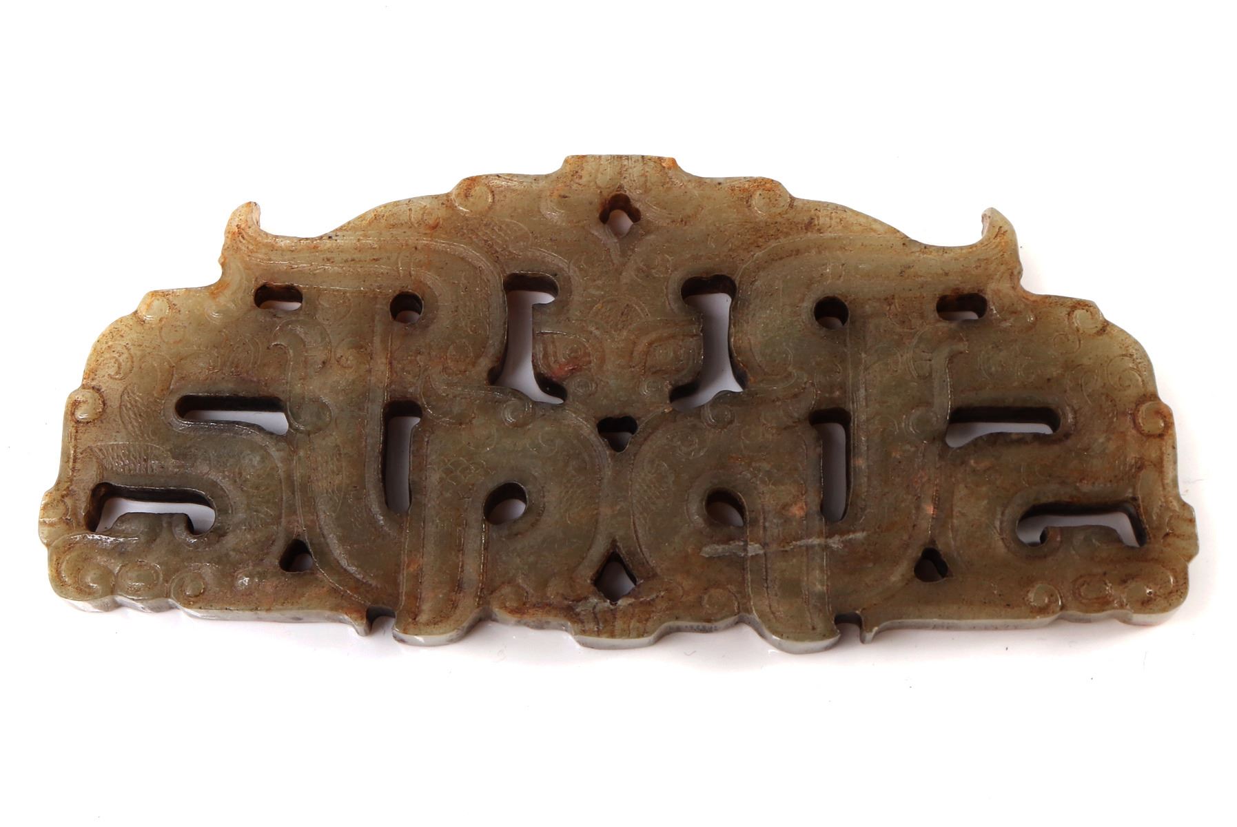 Chinese jade style stone carved pendant with incredible detailing throughout including pierced openwork incised detailing and geometric banding throughout. Size 5" L x 3" W weight 84g. Condition: Good overall condition.