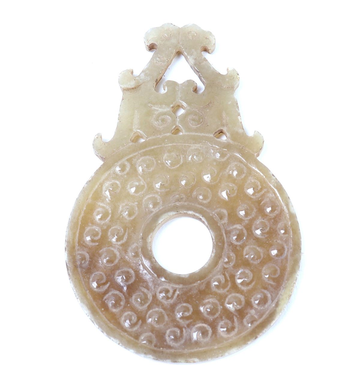 Finely carved archaistic style jade pendant with reverse phenix finials to the top. Openwork to the center for suspension with a textured surface. Size 3 1/8" L, weight 23 g. Condition: Good overall condition.