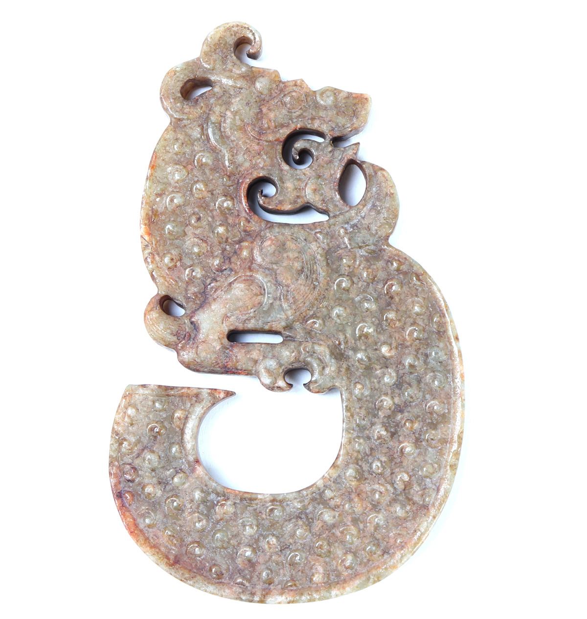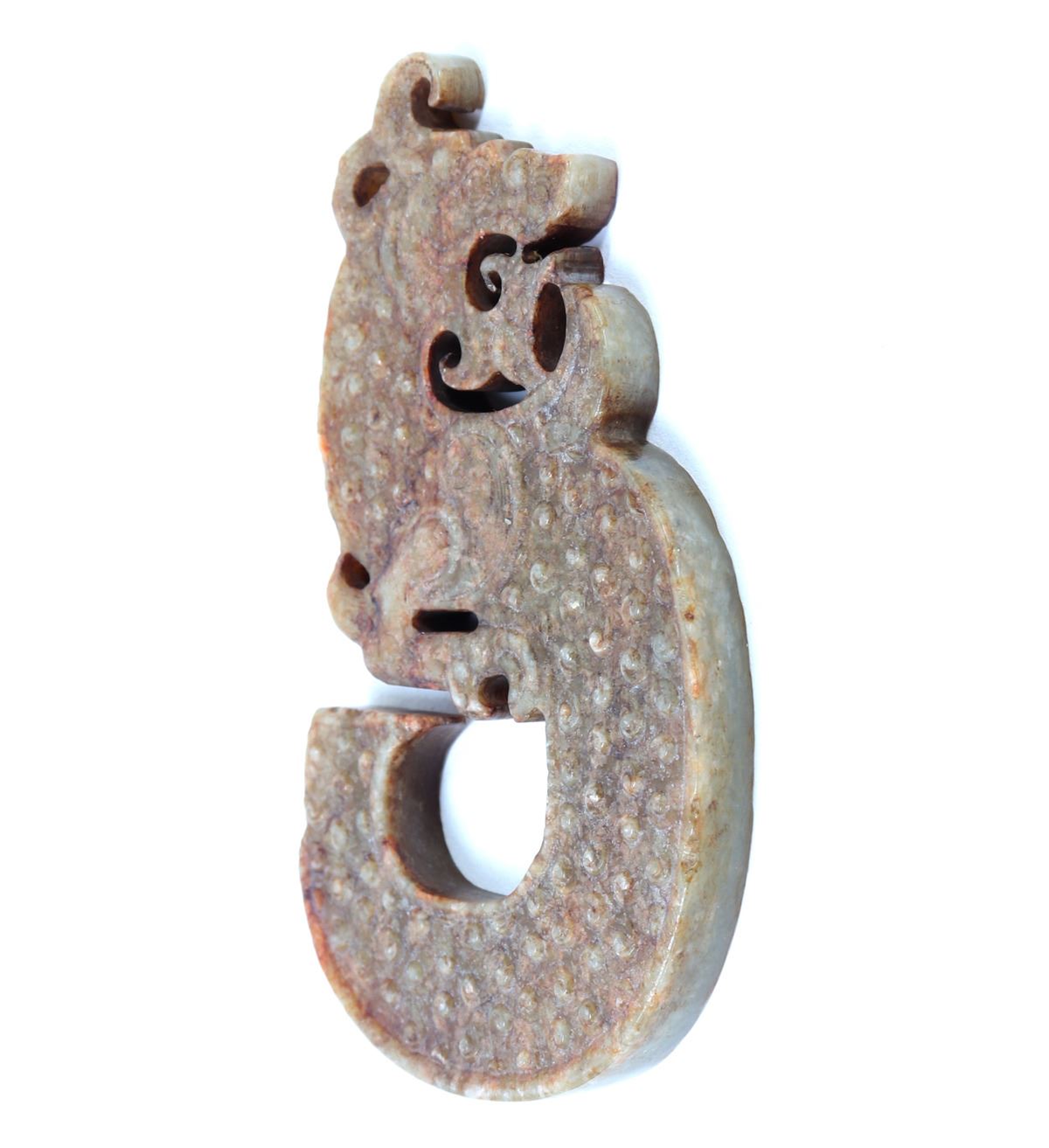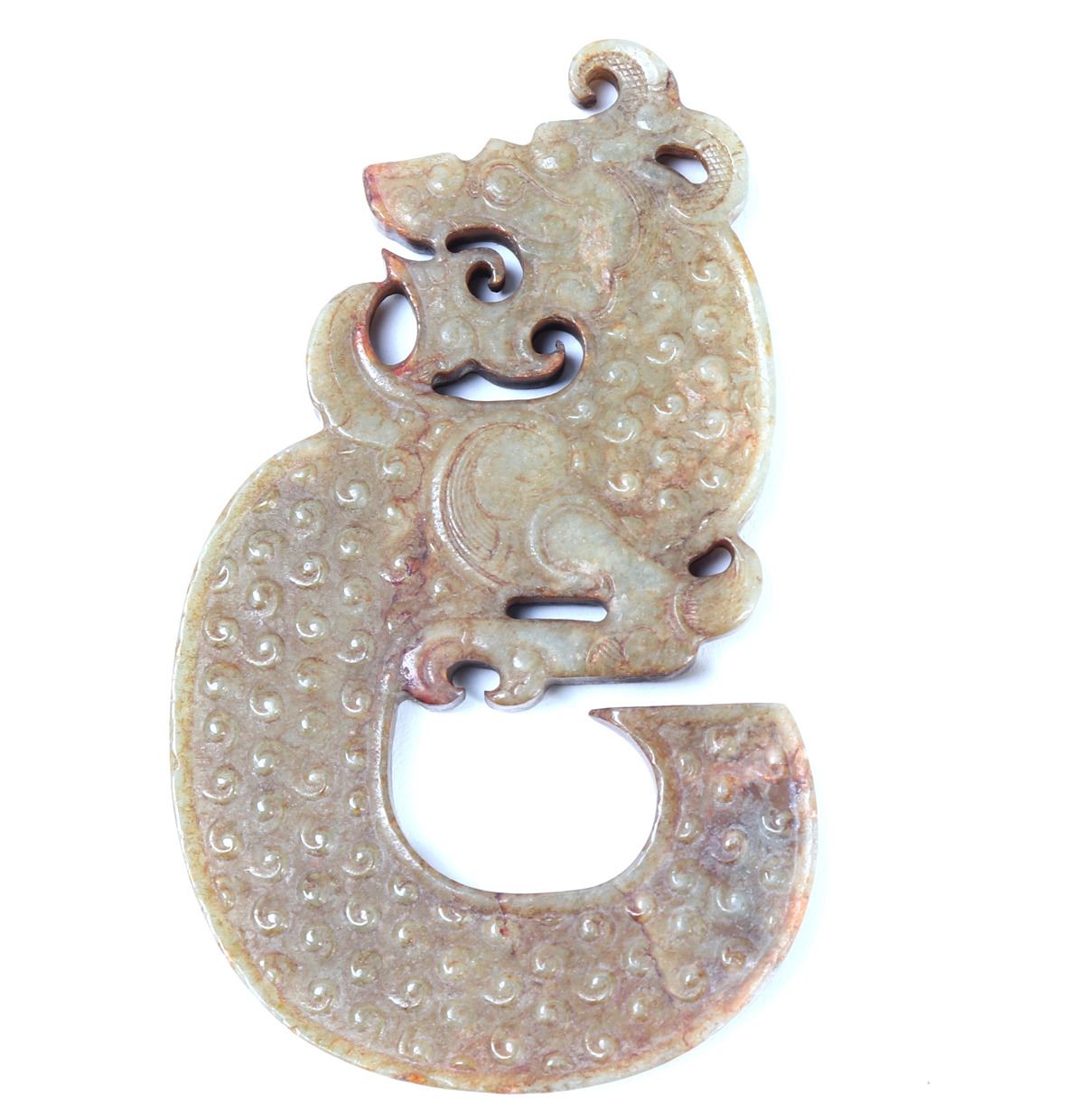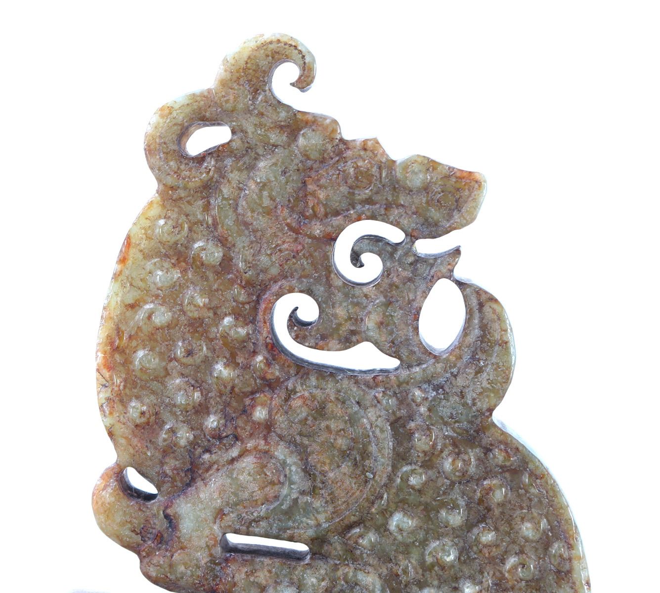 Chinese archaistic jade style plaque depicting a dragon or foo lion with head turned behind him with an elongated tail style curl beneath. Size 4 3/8" H, weight 100 g. Condition: Good overall condition with no obvious signs of restoration or repair.