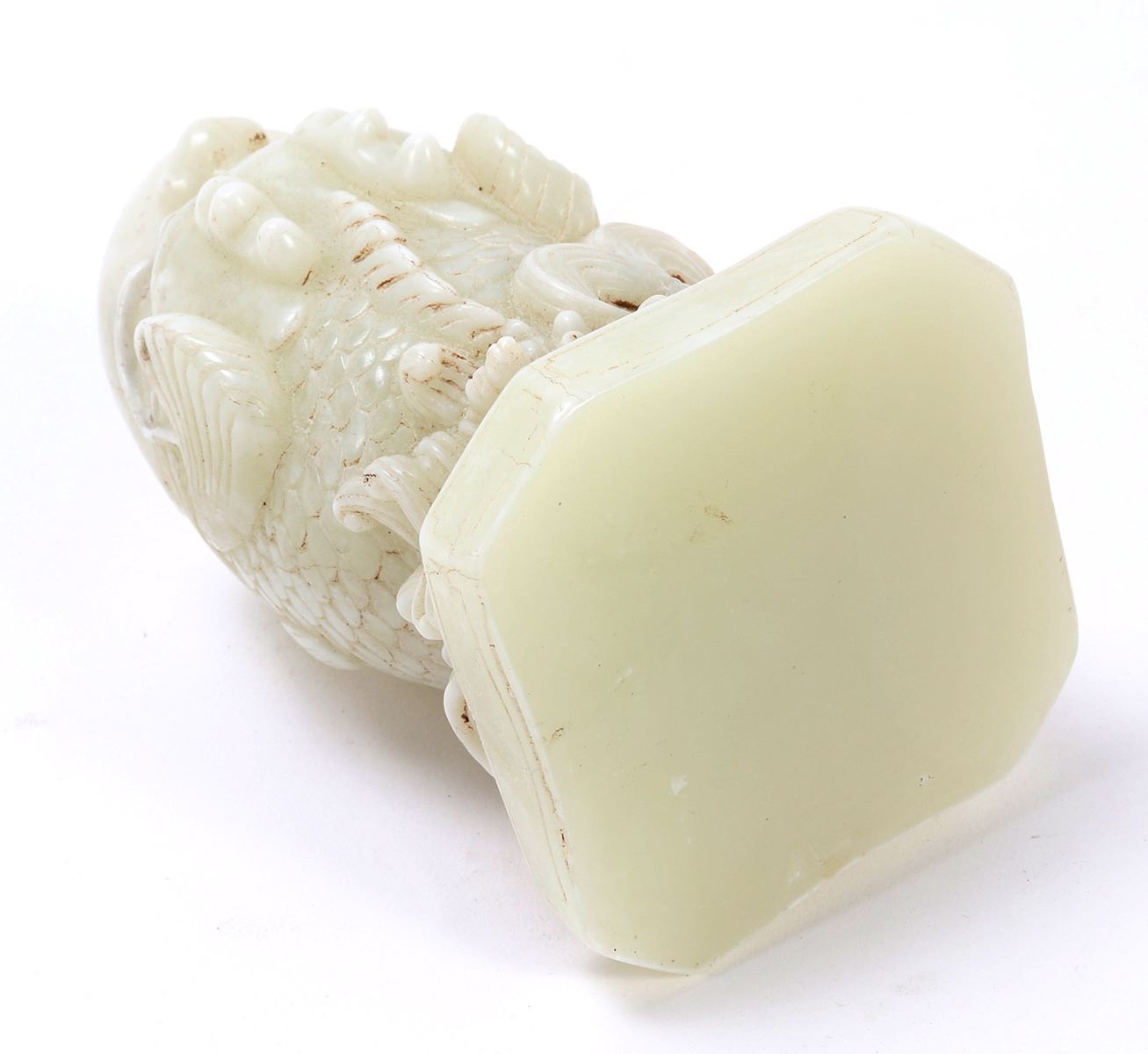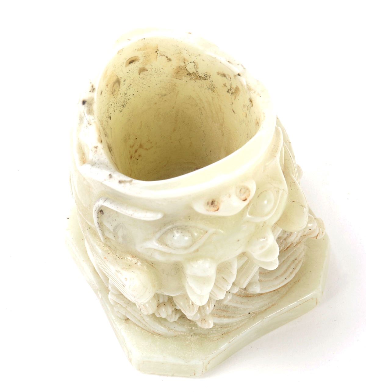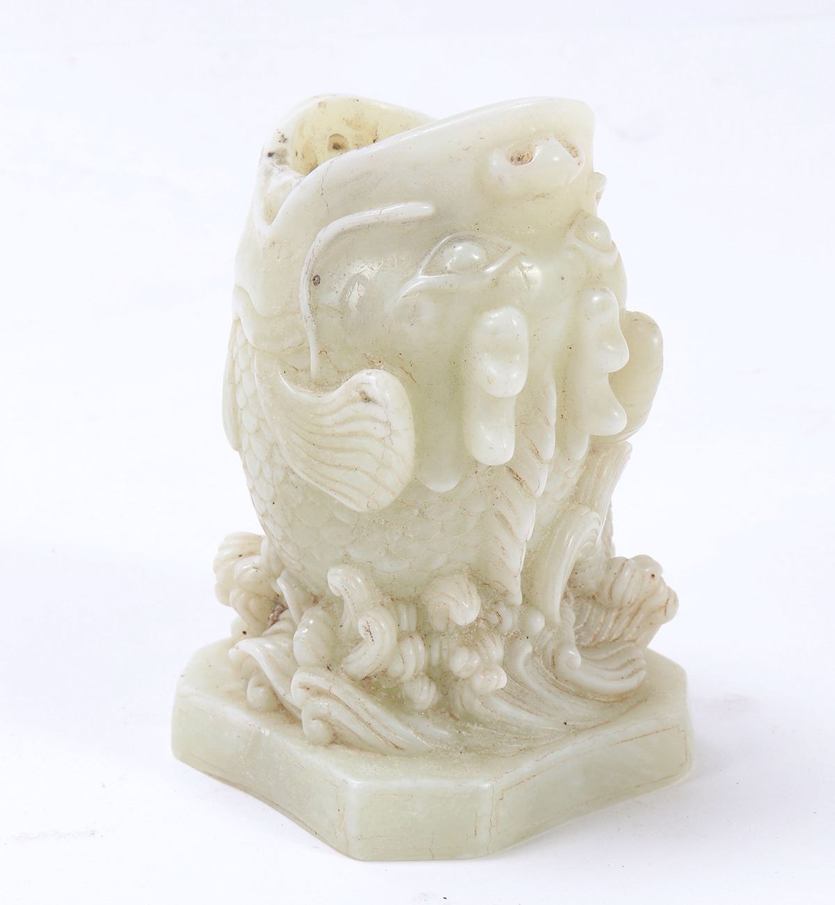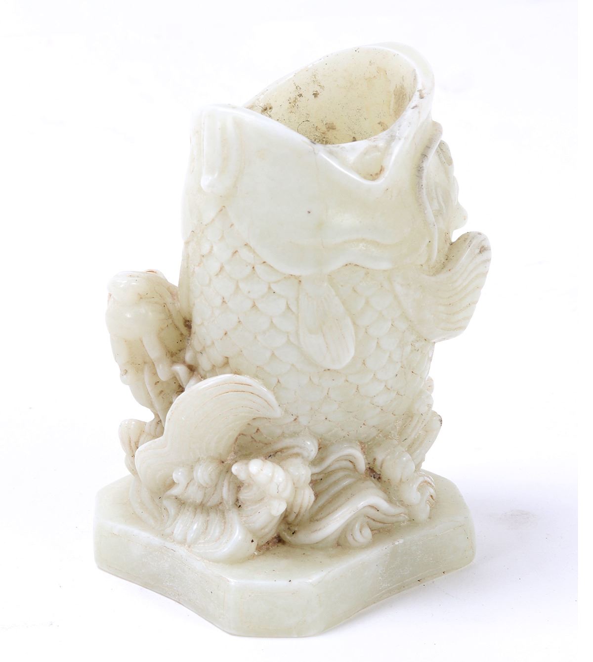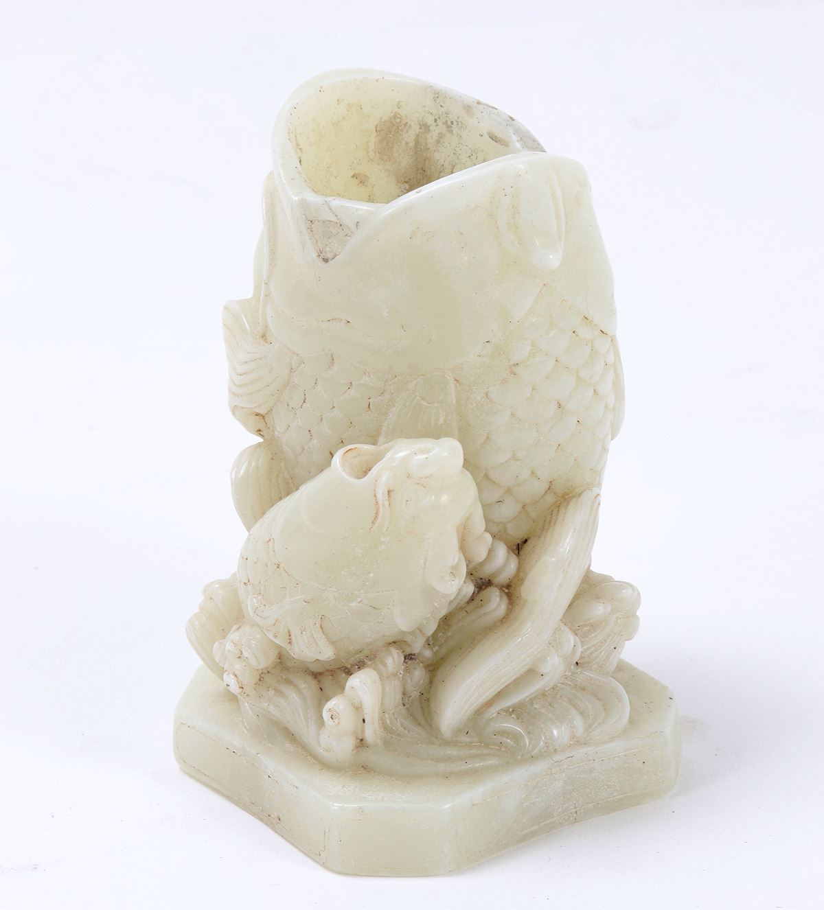 Fine Chinese hardstone carving of boxwood fish with fry, mouth agape to be used as a brush holder. Intricate details throughout including a boxwood fry, ocean waves throughout. Size 5 1/4" H, weight 2.5 lb.. Condition: Some soiling and pitting as shown.