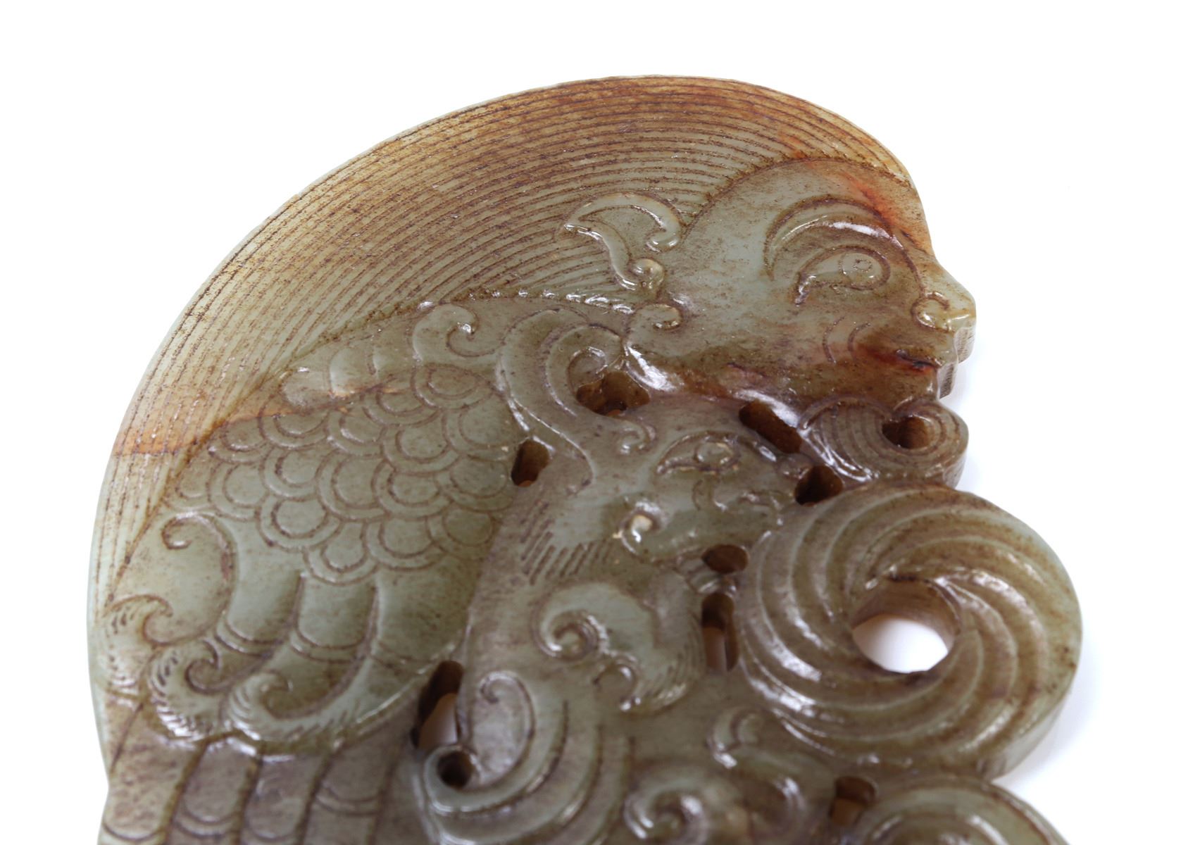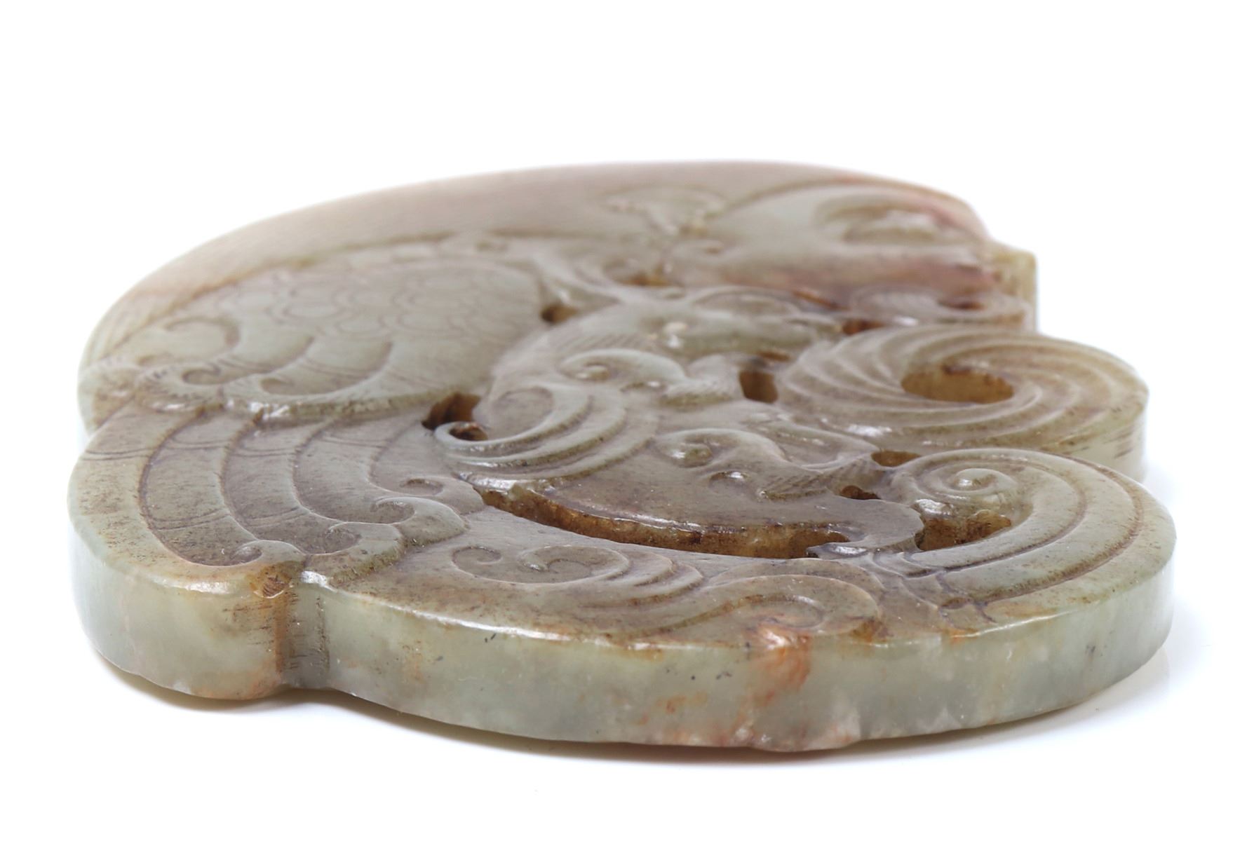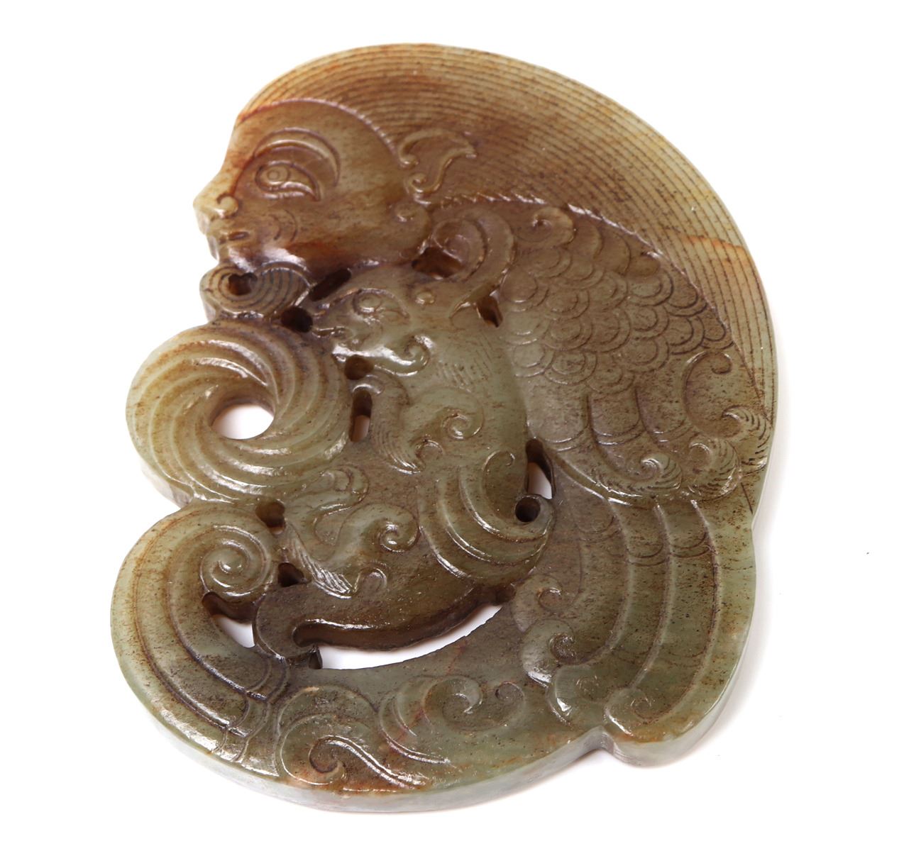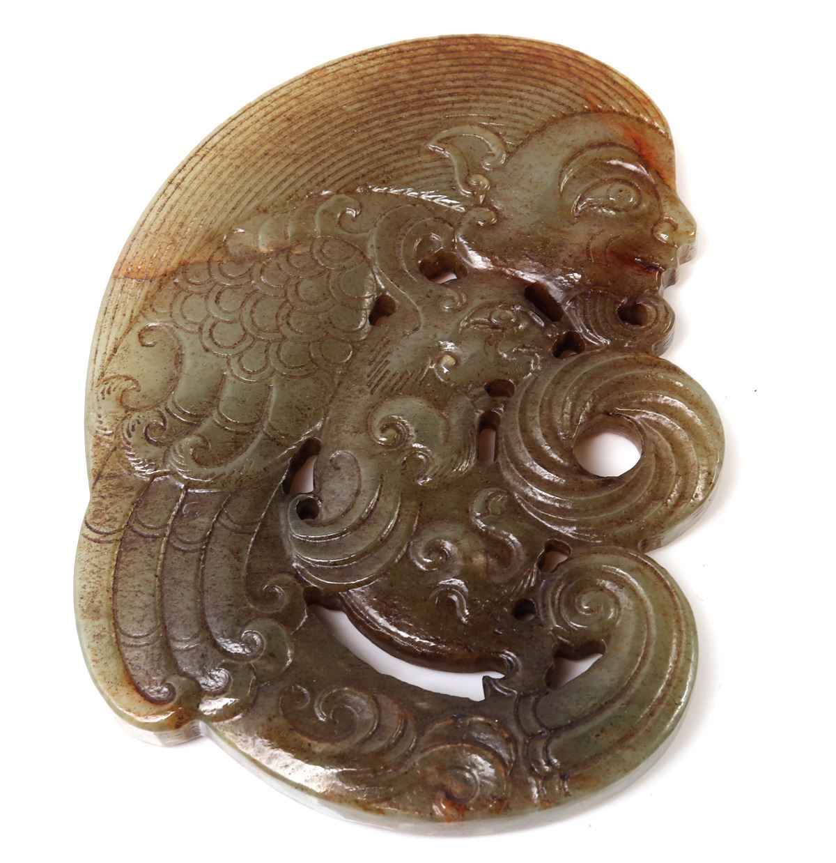 Wonderful marbled hardstone Chinese archaistic zoomorphic beast carving pendant with a humanoid face to the top and a jaguar kitten or rat to the center. Heavily incised details throughout. Size 3.5" L x 3.5" W weight 95g. Condition: As-is condition