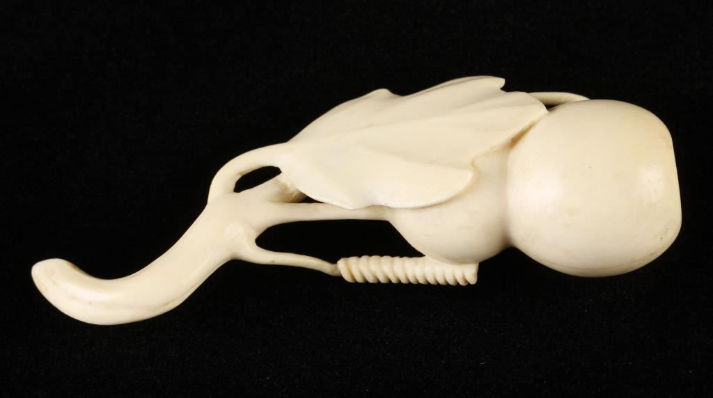 carved of a single piece of ivory, shows age, 3 1/4" long. Can only be sold in the state of Arizona by law and commerce, cannot be shipped. Excellent overall condition.