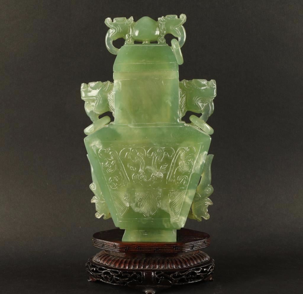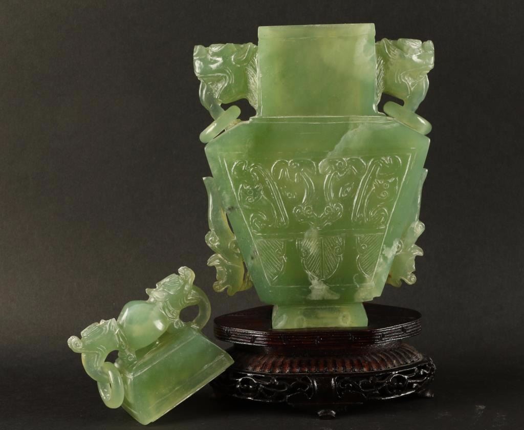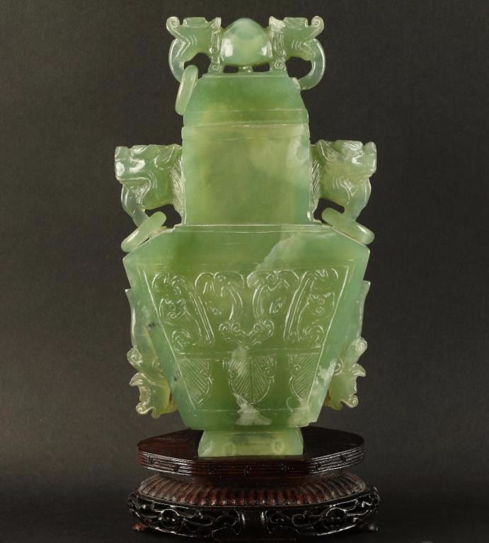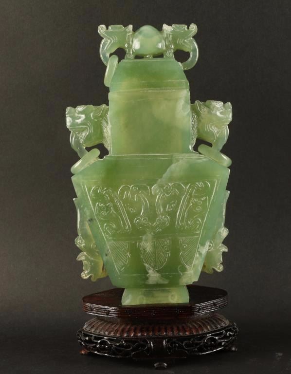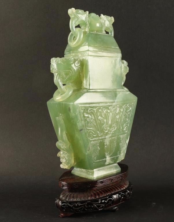 All green carved urn accented with dog head and rings. Front is ornately carved with a floral motif. Lid is removable. Condition is very good overall, however the ears on lid are chipped and one ring is missing. On wood base, measures 8 1/2"x4 1/2" at widest point.