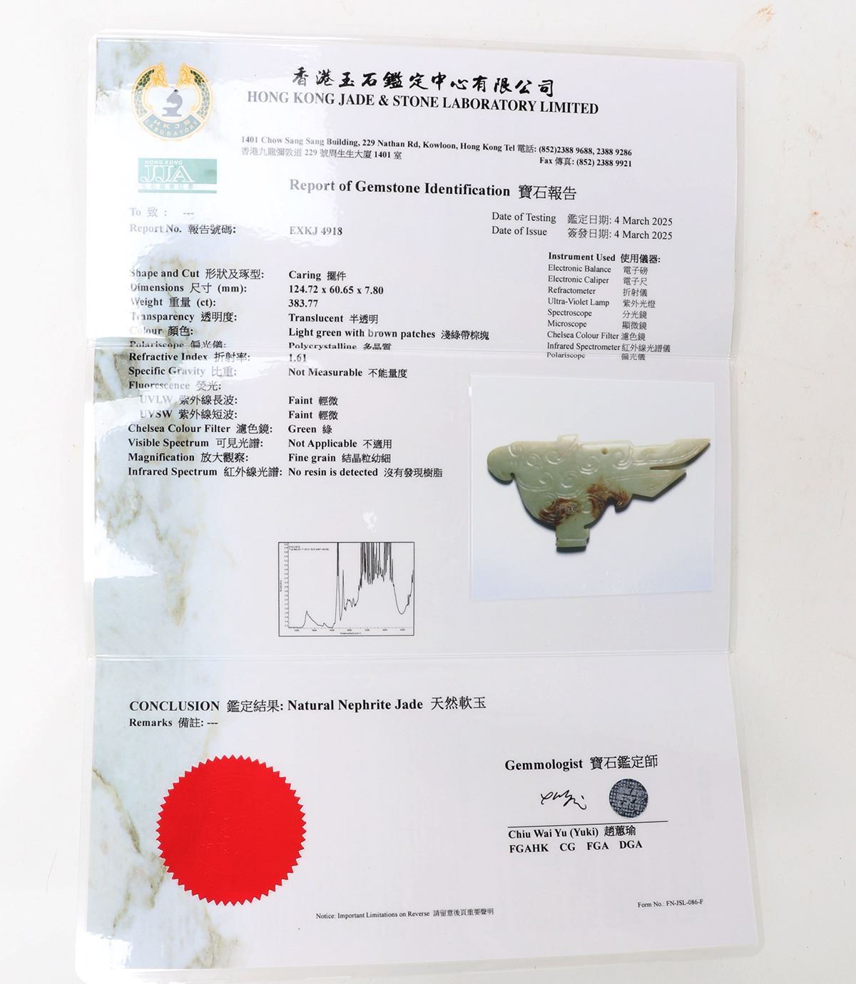 Lovely Chinese certified natural nephrite jade bird pendant. Incised swirled designs to the body throughout with split tail feathers and a downturned protruding beak. Pierced through the top for suspension. Mottled brown color to one side of the pendant. Size 4 7/8" L, weight 76 g. Condition: Good overall condition without signs of restoration or repair.