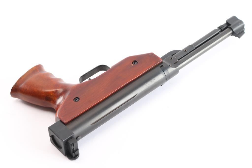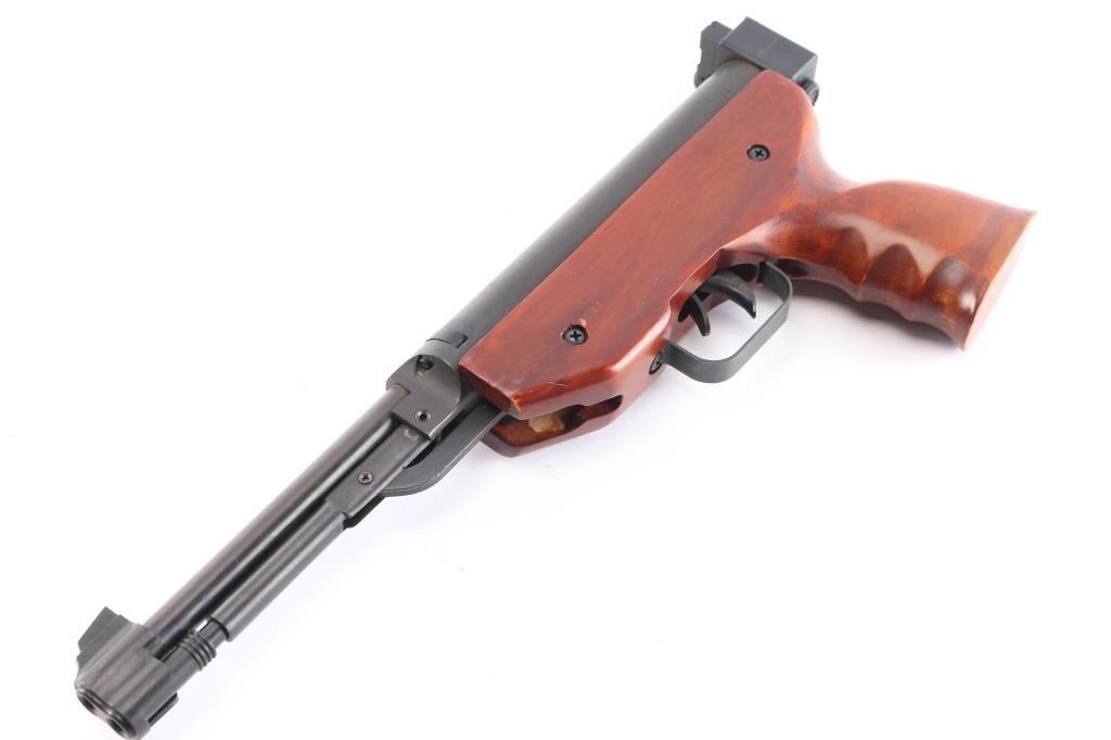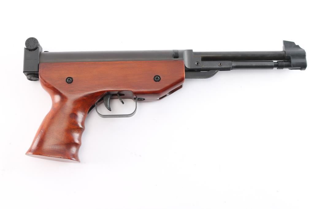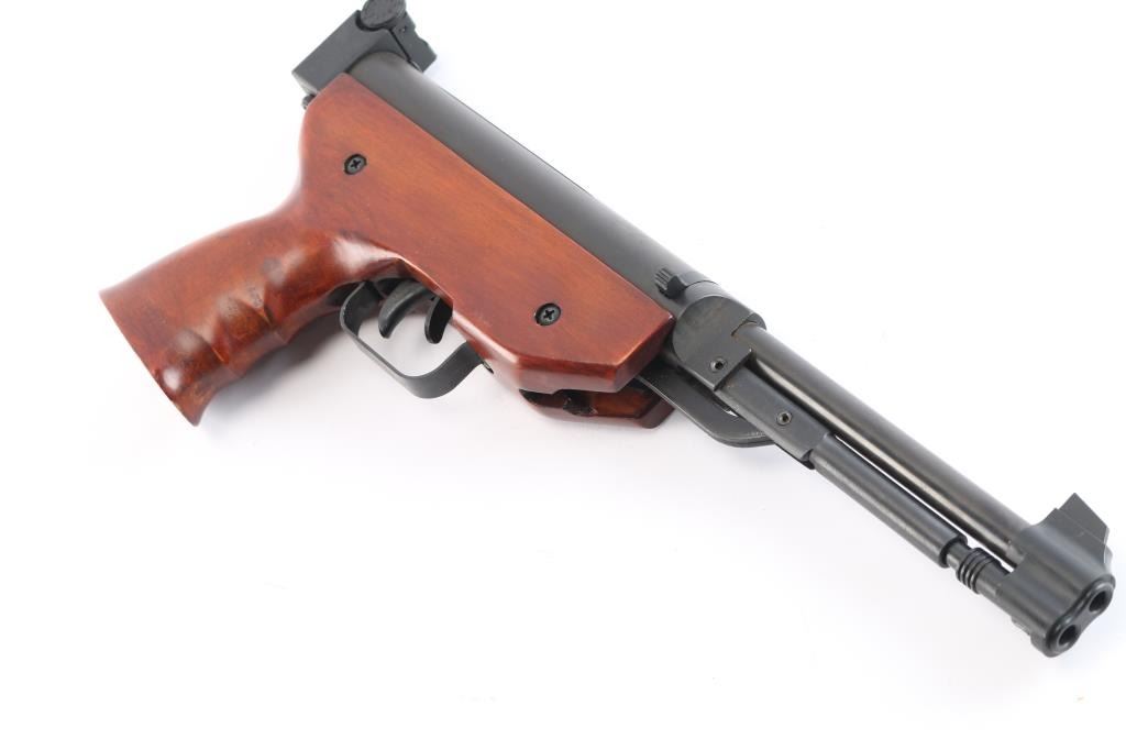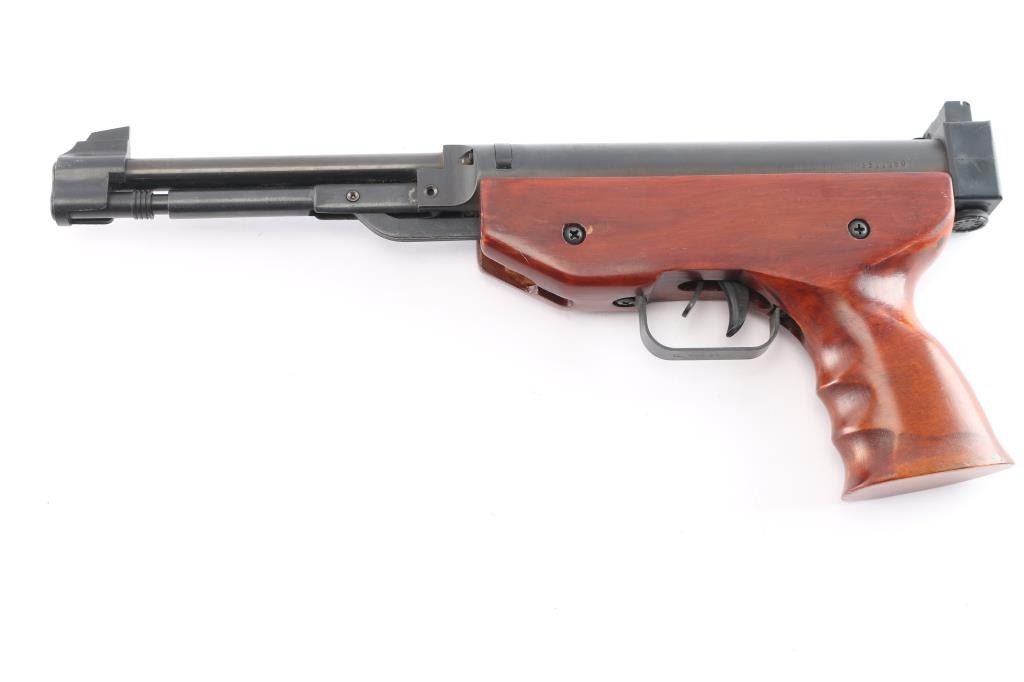 Chinese manufactured .177 Pellet Pistol. One piece wood stock with finger-grooved grip, break-barrel, adjustable sights, grooved for optics and manual safety forward of the trigger.. In good working order, excellent condition.