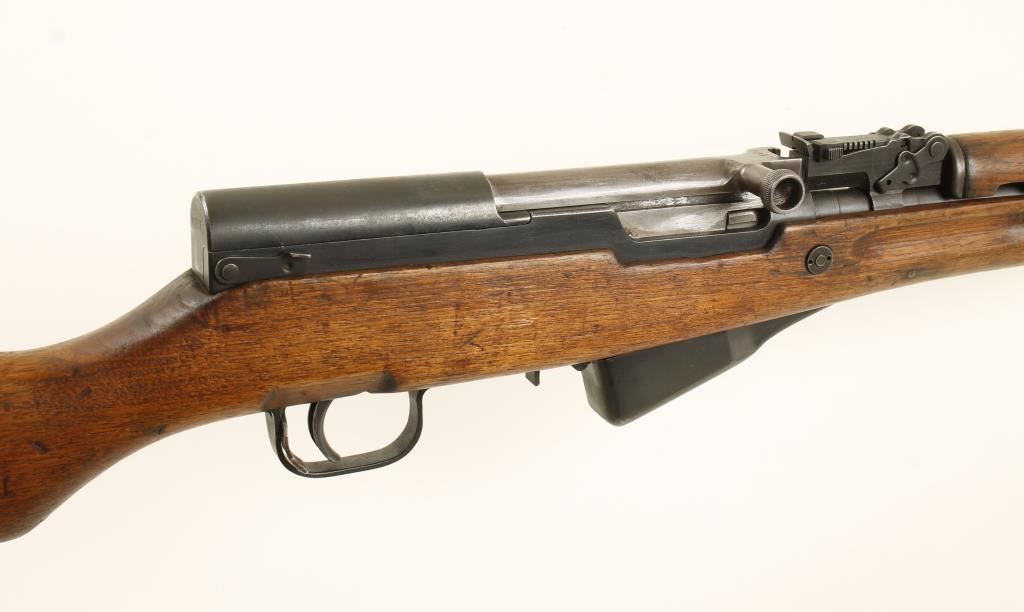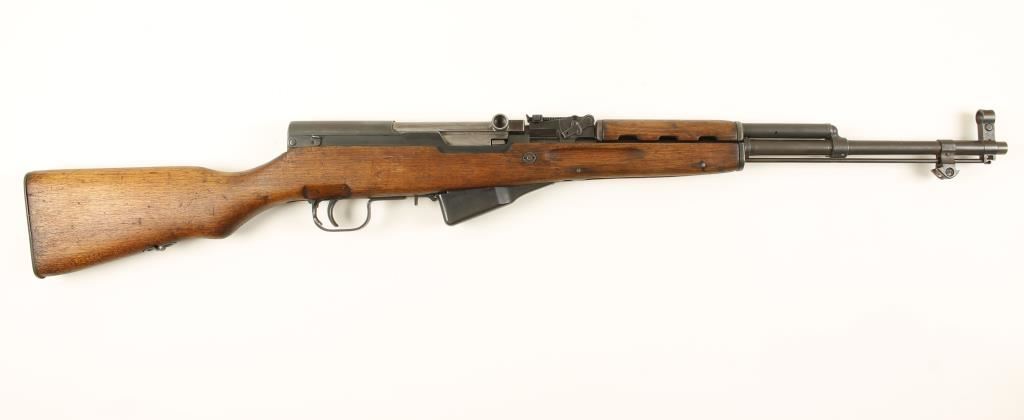 Chinese made semi auto military rifle with 19-1/2" barrel. Blued finish, oil finished wood stock, hooded front sight graduated rear sight to 1,000 meters, 10 shot fixed magazine. All numbers matching including stock. Very good bore and action. Condition: Good overall showing high point wear and dings and bruising in wood. *Modern Firearm*