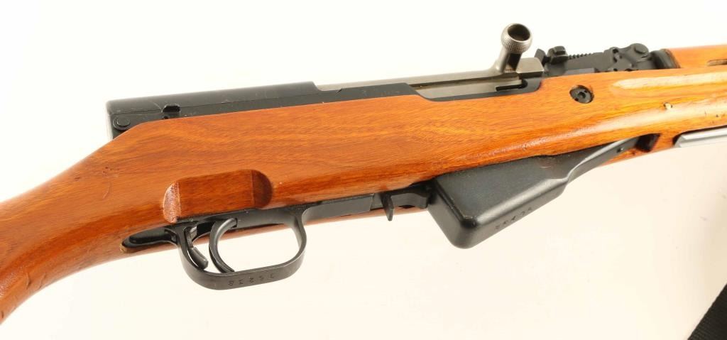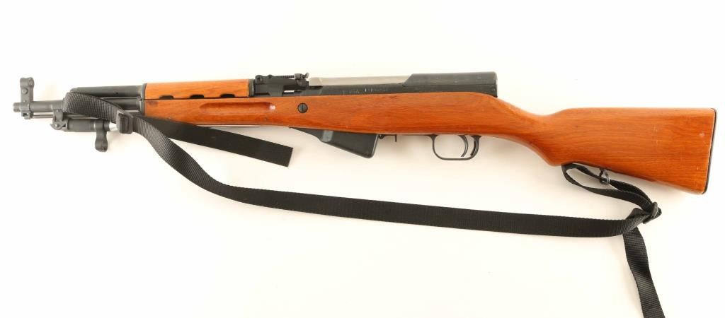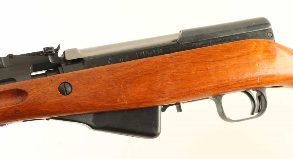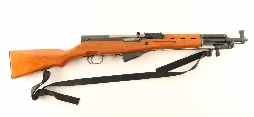 Modified Chinese military semi-automatic SKS pattern rifle manufactured at the Jianshe Arsenal circa 1967. Imported by KSI , Pomona Ca. , marked on the left receiver. Paratrooper type carbine, with 16.5" barrel. Fold-up spike bayonet with 8" bayonet. Short stroke gas piston, tilting bolt, self-loading action. 10-rd stripper-clip, internal box magazine. Hooded , elevation adjustable front sight post. Tangent notch rear sight graduated from 100 to 1,000 meters. Blued metal finish, chrome bolt. Steel butt plate, with trapdoor. Cleaning rod present. Laminated wood stock, with ventilated handguard. Matched serial numbers. Non-issue black nylon sling attached. Action is smooth/tight. bore appears excellent/bright. Wood is very good, with a few minor scratches/dings. blued finish is about 97%, with some edge wear, scratches, rubs. NRA Condition-Near Excellent. Modern firearm. C&R Eligible.