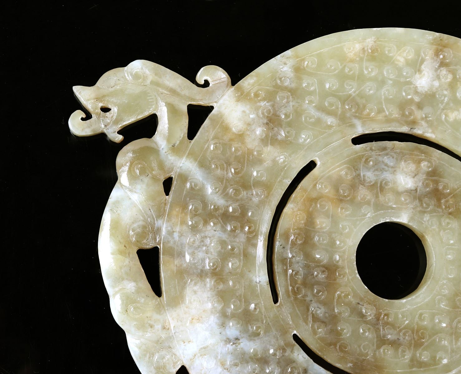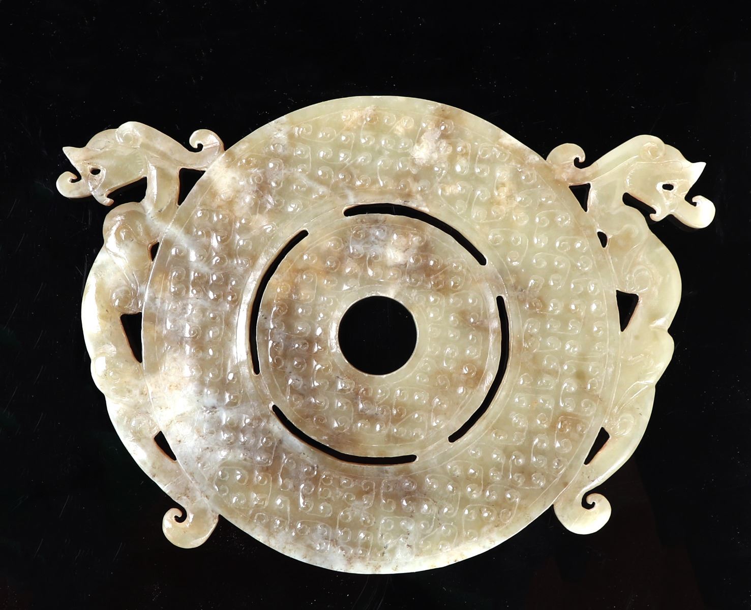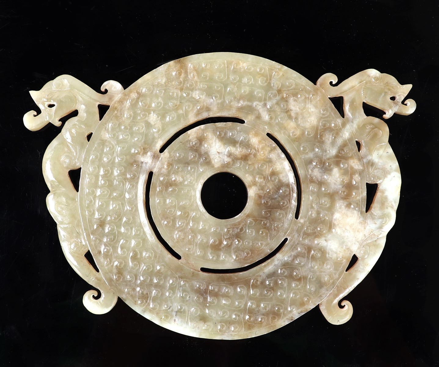 Very nice Chinese jade disc with a pair of dragons on the exterior of the double disc, open work to the center including a ring around the middle ring. Bubble texture to both sides of the disc. Beautiful light green to mottled white coloring throughout. Size 5 1/2" W, weight 130 g. Condition: Good overall condition with no obvious signs of damage or repairs.