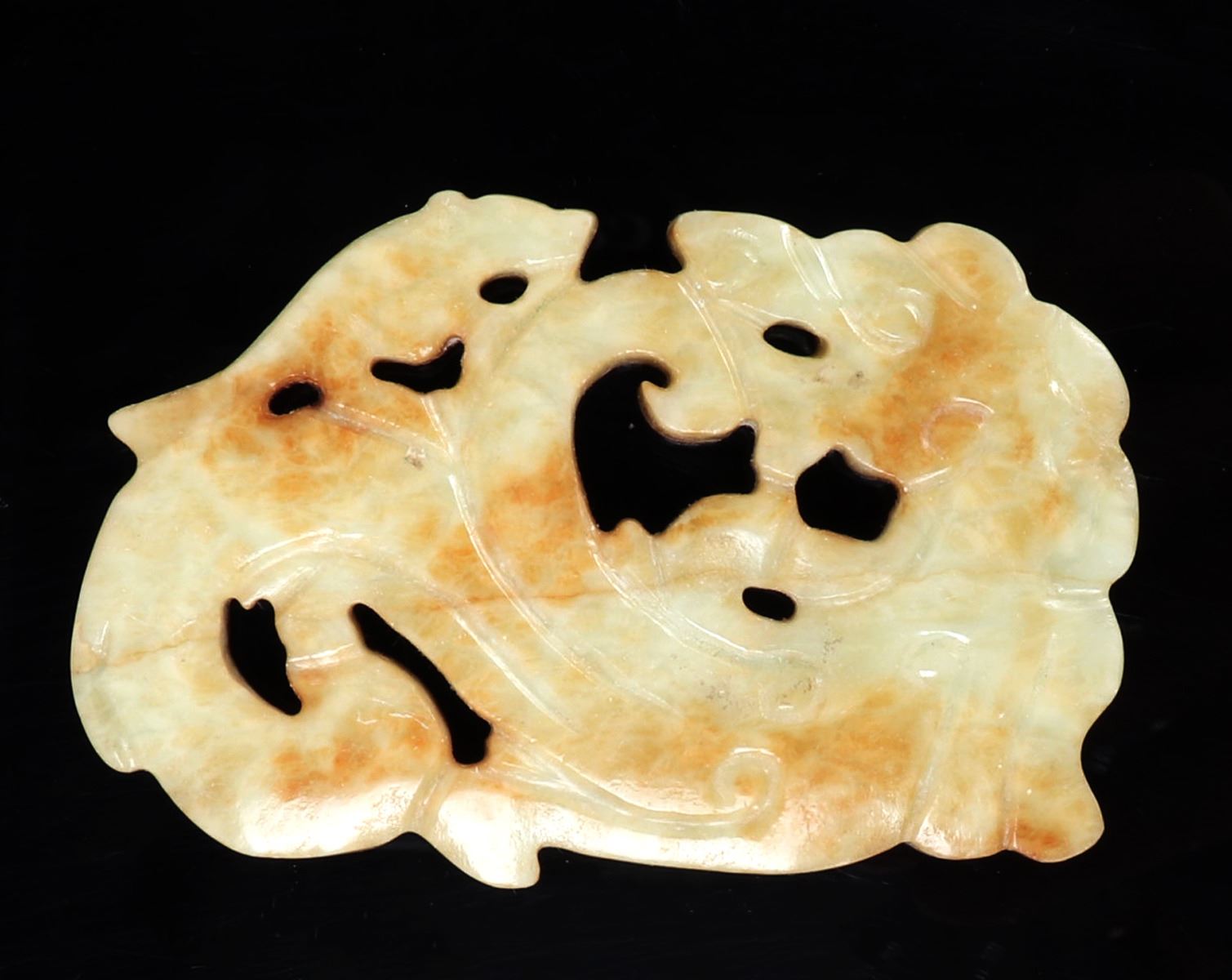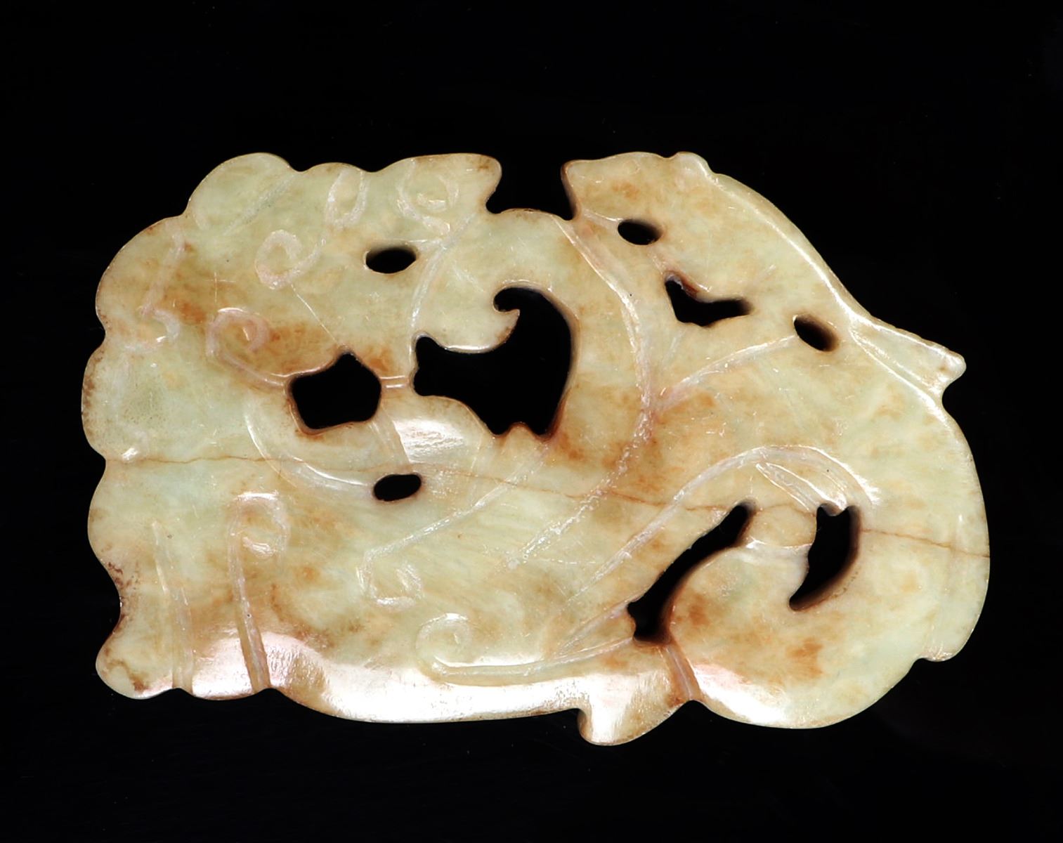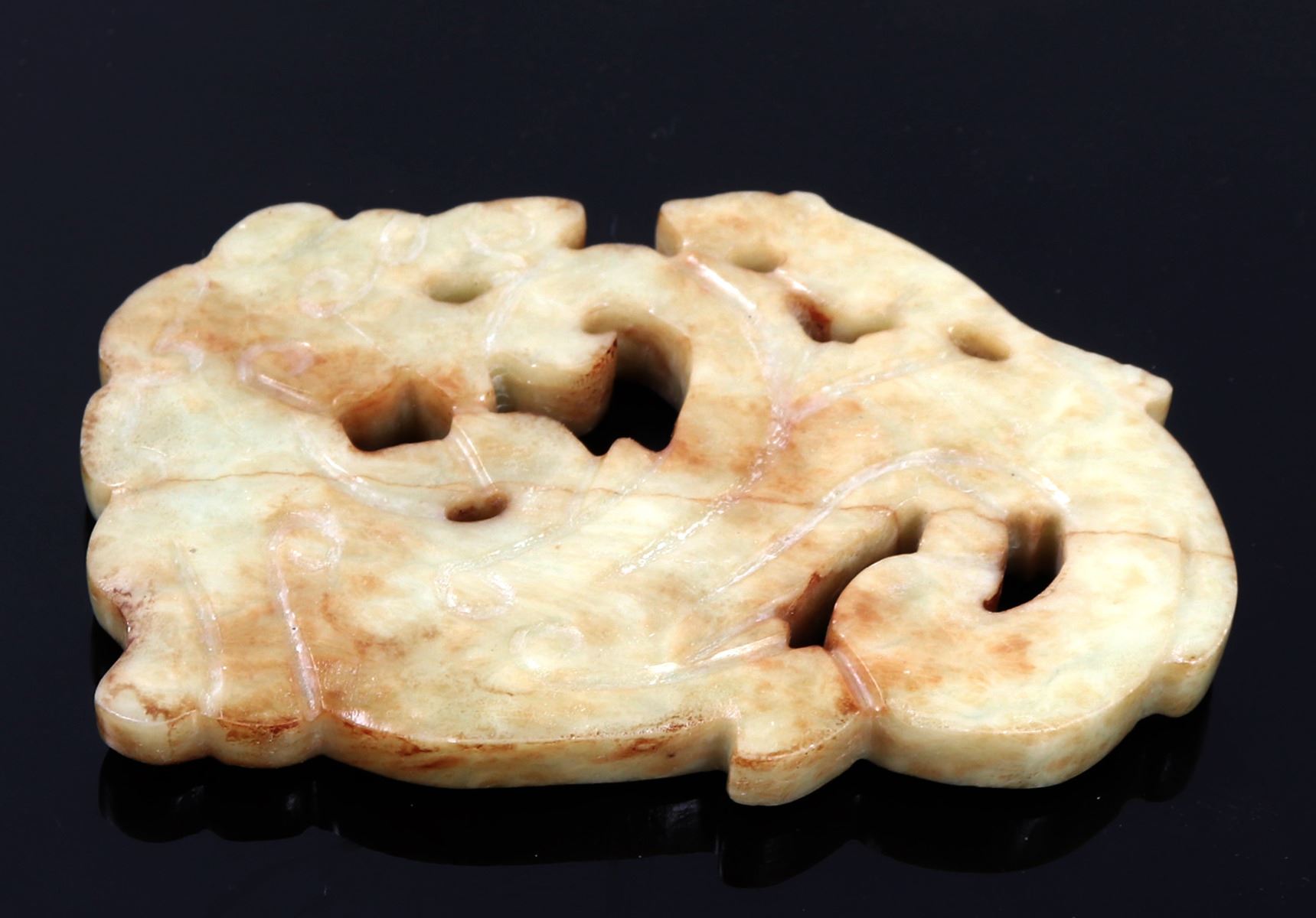 Lovely Chinese white hardstone carving of a dragon with openwork throughout, scales incised throughout the body. The dragon is poised backwards with a long tail and flames pouring from his mouth. Size 2 3/4" L, weight 38 g. Condition: Good overall condition with some soiling, stable fissure through the body, no obvious signs of restoration.