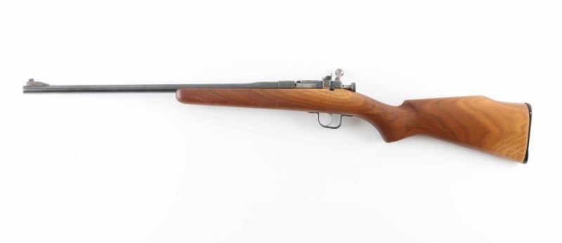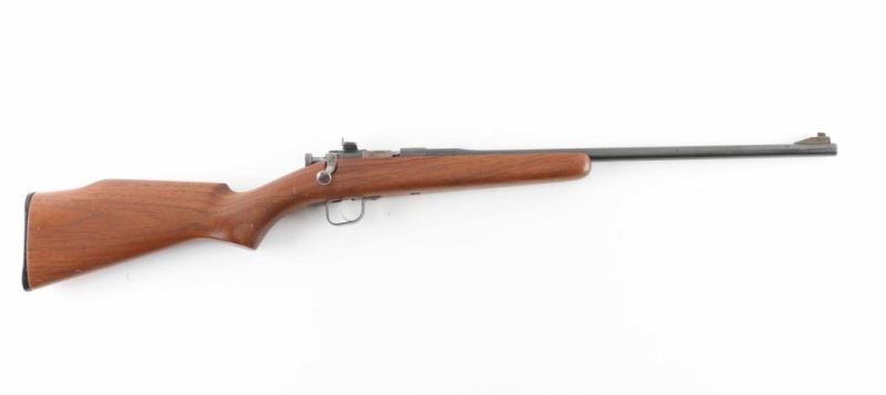 Great starter rifle for the kids. Single shot, bolt action rifle chambered for .22 S/L/LR cartridges. Blued barrel and receiver retain most of the finish. Raised blade front sight, peep sight rear. Nice wood stock with plastic butt plate. Gun shows some signs of wear but very little. The bore looks great. NRA Very Good Modern Firearm