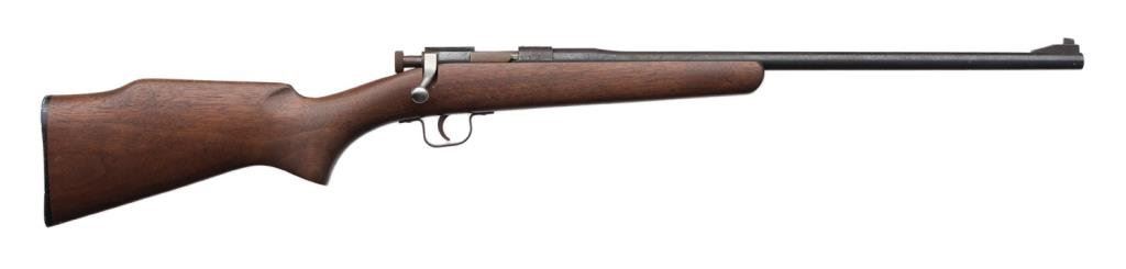 Chipmunk Mgf. Co. (Medford, OR) child’s bolt action rifle, .22 short, long or LR caliber, 16” round barrel, S/N 9713, blued finish, wood stock in overall fair condition with considerable original blue remaining under a light coating of rust from storage; good bore, good wood, good markings; action needs repair. Est.: $40-$80.