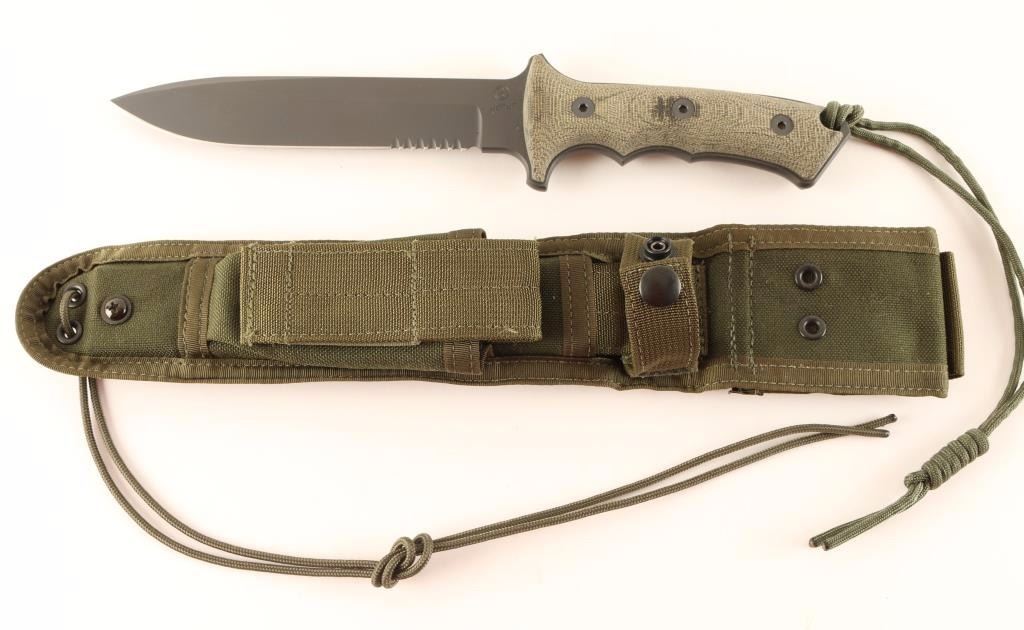 Designed and engineered by Chris Reeve and William W. Harsey. Dorsal tapered profile black PVD blade and Rockwell hardness of 55-57 with a contoured canvas micarta handle. Marked with Chris Reeve logo and 'Harsey' Measures 12 1/4" overall with a 7" blade. Comes with a green canvas sheath.