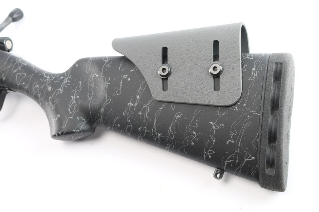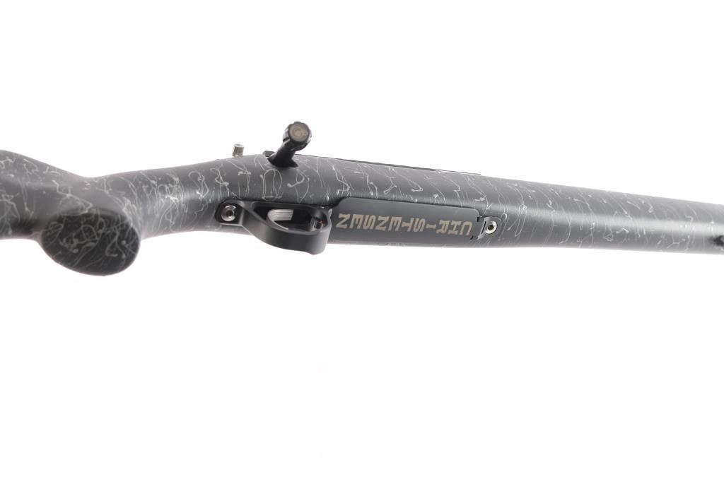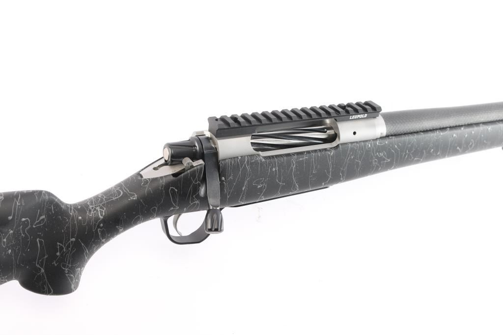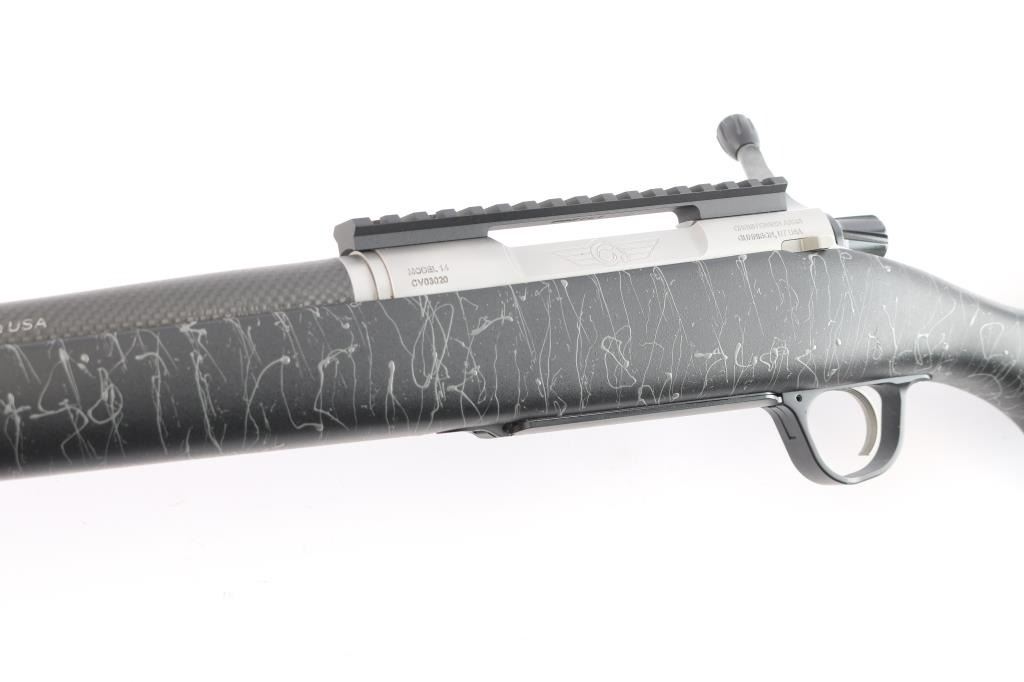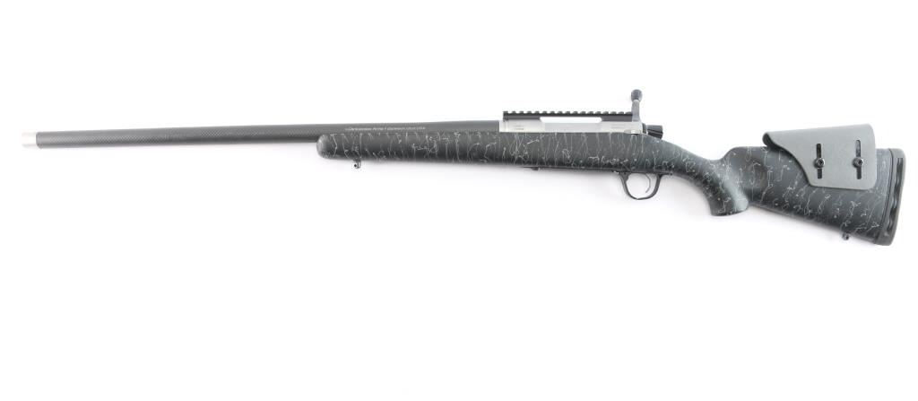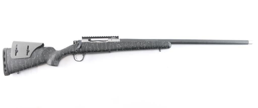 Sn: CV03020. Optics Ready. 26” 1-8 Free Floating, Hand Lapped, Button Rifled, 416R Stainless Steel with Aerograde Carbon Fiber wrap and Match Chamber with threaded muzzle/protector. No provisions for sights. Black Carbon Fiber Composite Sporter Style with gray webbing, stock features semi-grip, Stainless Steel Bedding Pillars, Spot Bedding, sling studs, adjustable comb and Limbsaver recoil pad. The LOP-13.5” , internal box magazine with hinged floorplate, manual thumb safety, fluted two lug bolt, skeletonized bolt handle, trigger Tech serrated, adjustable trigger. Leupold multi-slot scope base. Bore is excellent/bright, rifle and scope are like new.