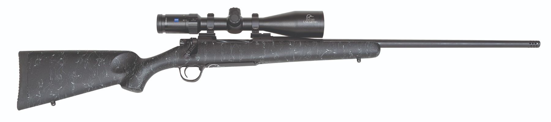 Premium-quality bolt-action rifle chambered in .300 WM. Ready to shoot with a Zeiss Conquest V4 3-12x56 scope, mounted and bore-sighted. 24 inch featherweight barrel with muzzle brake. Black Cerakote finish on outer metal surfaces. Black composite stock with contrasting webbing. DU logo featured on the rifle and the optic. Premium quality aluminum rifle case. Gun lock included.