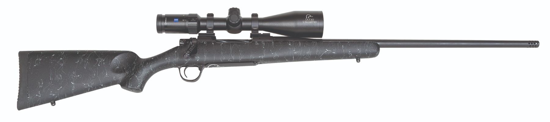 Premium-quality bolt-action rifle chambered in .300 WM. Ready to shoot with a Zeiss Conquest V4 3-12x56 scope, mounted and bore-sighted. 24” featherweight barrel with muzzle brake. Black Cerakote finish on outer metal surfaces. Black composite stock with contrasting webbing. DU logo featured on the rifle and the optic. Premium quality aluminum rifle case. Gun lock included.