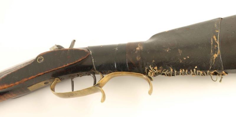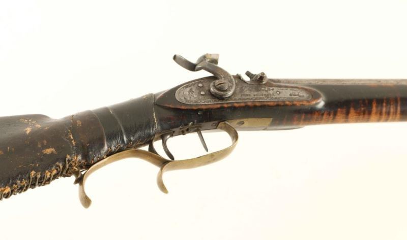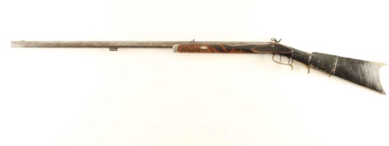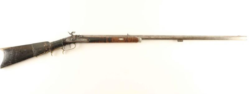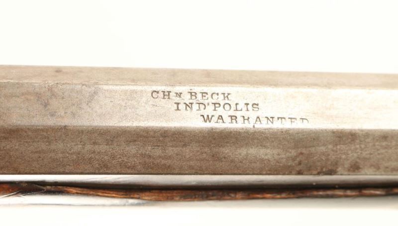 Half-stocked percussion plains rifle with an approximate .36 caliber bore, stamped "CHN BECK/IND'POLIS/WARRANTED" on the barrel in block letters. Features a rifled 33 1/2" octagon barrel, German silver blade front sight, dovetailed rear sight, double set triggers, brass finger rest trigger guard, scroll & hunting scene engraved lock marked "FORD BROTHERS", no ram rod, and straight grip tiger striped wood shoulder stock with pewter forend cap & brass crescent buttplate. The rifle displays a light grey patina with scattered dark oxidation and browning. Action is in working order with a repaired hammer, the bore is pristine and the wood stock is fair showing a severe crack at the wrist that has been repaired and covered with leather. Condition is NRA Good. ***Antique Firearm***