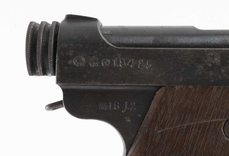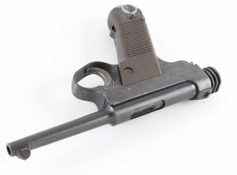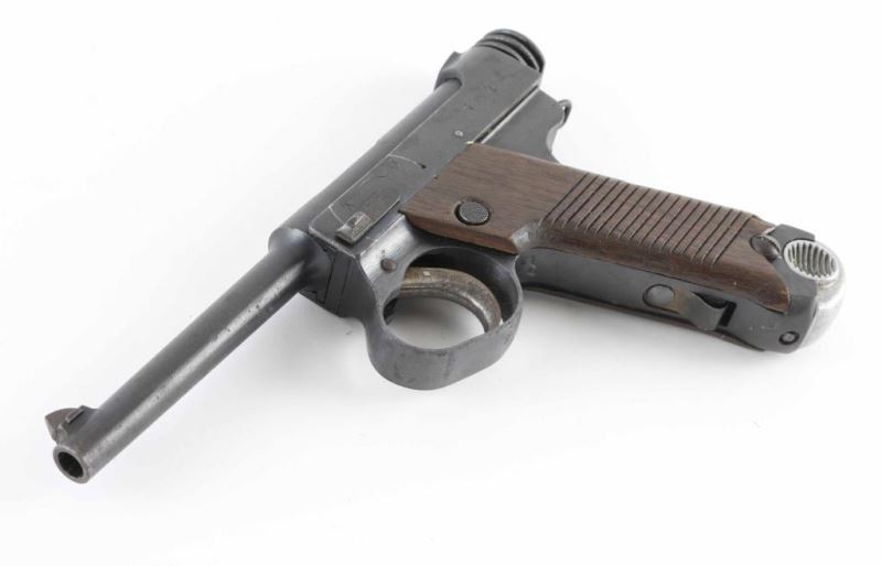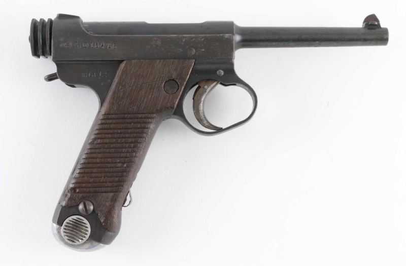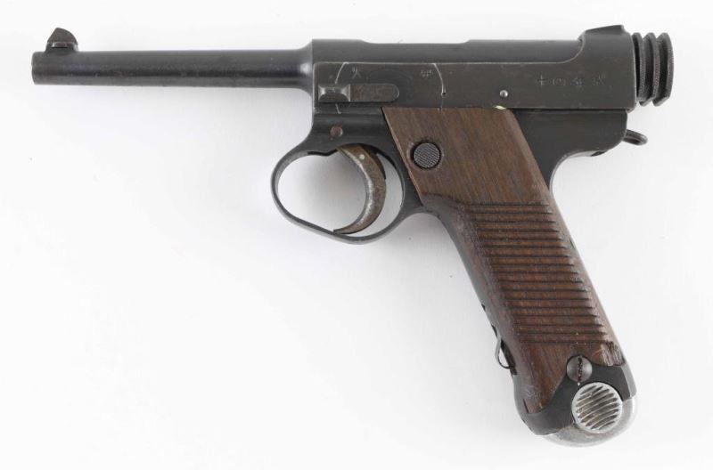 'First Series Nagoya Nambu' WWII era Japanese military striker fired semi-automatic service pistol chambered in 8mm Nambu. Features a blued finish, 4.6" barrel, dovetailed inverted 'v' front sight, fixed square notch rear sight, rounded trigger, large trigger guard, knurled grooved cocking piece, manual safety on the left side of the frame, magazine disconnect safety, push button magazine release, 8 round magazine with aluminum base plug, steel frame with lanyard loop on the rear and grooved wood grips. Front sight installed backwards. No import marks have been observed. Bore is very good condition. Retains 60% finish, with areas of patina throughout, some shallow pitting, a bright drag line on the frame from the safety lever, bare metal on sharp edges and around muzzle. Trigger shows good straw color. Grips are good serviceable condition, scratched and lightly gouged, with an overall dark coloration. Markings are clear and readable. Condition is NRA Good++ *** C&R Firearm ***