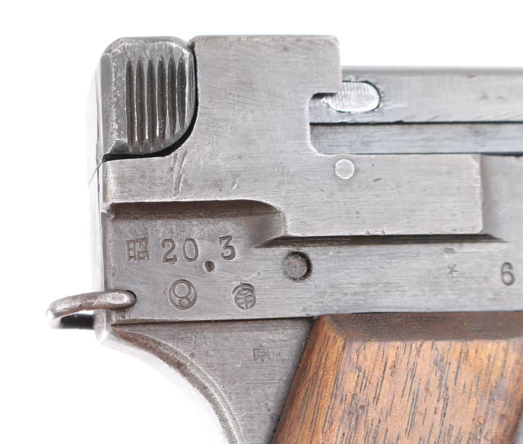 Semi-Automatic chambered in 8x22mm. "Matching Magazine". Late war Japanese WW2 issued pistol. Recoil-operated, locked breech. 6-rd magazine. 3.78" barrel, fixed sights, manual safety, lanyard loop. Produced 1935-1945. Chuo Kogyo Arsenal marked. Dated 20.3 (May 1945). Bore is excellent/bright. Late war smooth wood grips are very good. Action is crisp/tight. Blued metal finish is fading, about 70% with edge wear/scratches, handling wear to the straps. Comes with blued magazine matched to the pistol. (800) NRA Condition- Near Good. C&R Firearm
